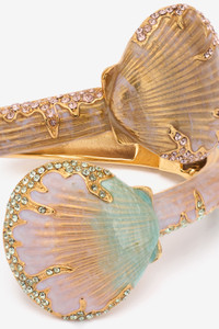 ID: UWG019-AM072-T0078 The sea and its treasures are the source of inspiration for this bangle featuring shell-shaped ends covered with an enameled finish that reproduces a refined mother-of-pearl effect on the one end and, on the other, the delicate shades of a beach at sunset. Along the main section and on the edges of the shells, this Roberto Cavalli piece is also decorated with thin gold-tone castings set with sparkling crystals. Details - Bangle with shells on the ends - Enameled finish on the shells - Set crystals - Double spring opening Care & maintenance Composition:Brass, Enamel, Glass