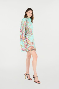 ID: VKT160-RLP76-D1961 A colorful pattern placed with flowering branches and pheasants, arranged on a background with the iconic Python motif in a monochrome version, is the absolute protagonist of this shirt dress made of pure cotton. In this refined short-cut model by Roberto Cavalli, the essential silhouette gains character thanks to the structured shirt collar and French cuffs with matching covered buttons. The design is completed by the front fastening with a top visible golden button. Details - Pure cotton shirt dress - Placed print with flowering branches and pheasants - Monochrome Python pattern in the background - Straight cut - Placket with hidden buttons - Front button fastening, the first of which is visible - French cuffs with matching buttons - Logo label inside the collar