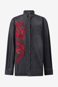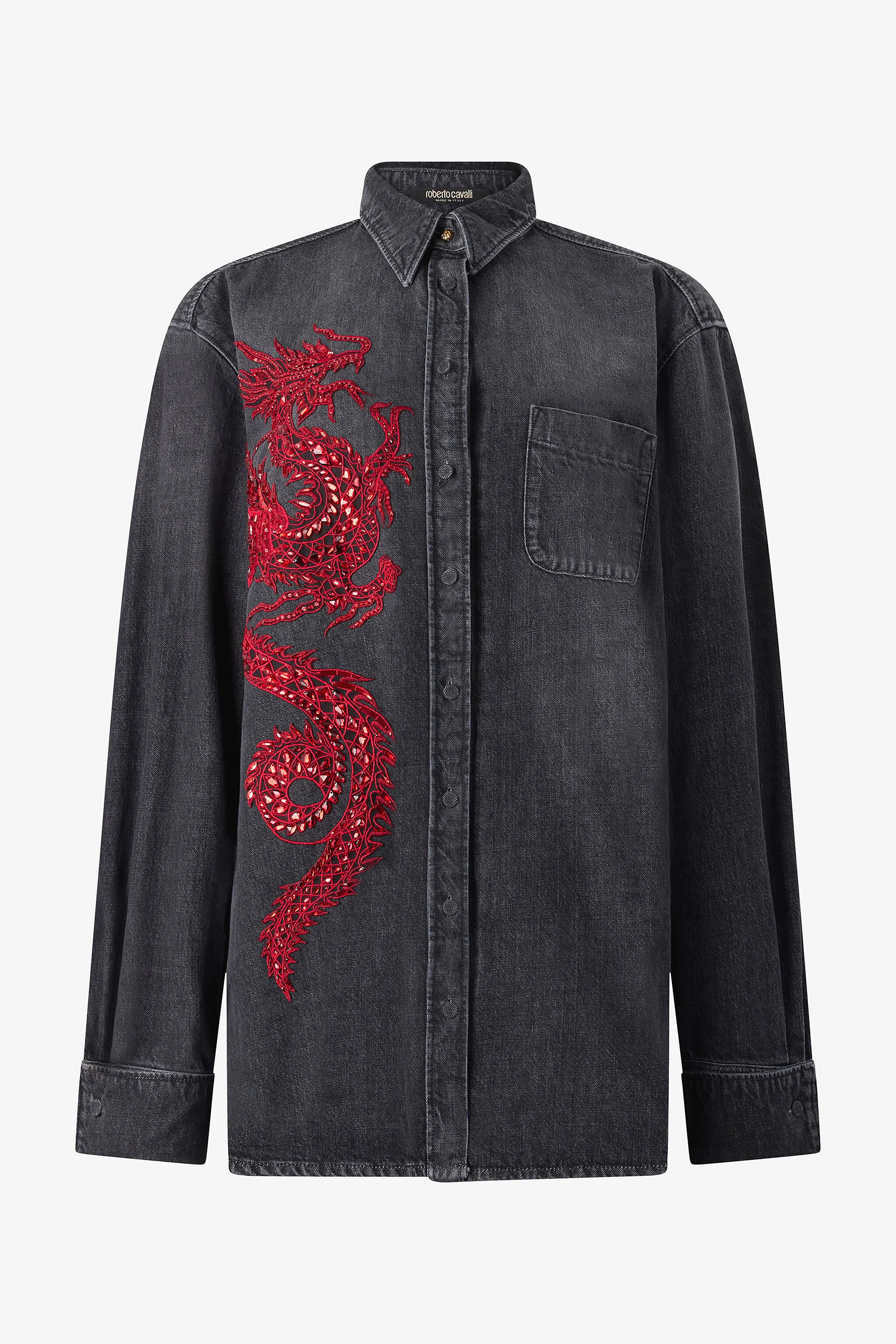 ID: VQJ161-DN001-05051 The reptile universe, one of the Maison's greatest sources of inspiration, is expressed in this pure cotton denim shirt through a legendary kindred creature: a dragon embroidered in a vibrant contrasting tone finished with meticulous sequin workmanship that reproduces its scales. In this sophisticated design by Roberto Cavalli, the clean silhouette gains character thanks to its structured style, featuring a collar with a visible top button and French cuffs with matching covered buttons. A perfect piece to add a touch of wild sophistication to your everyday outfits. Details - Pure cotton denim shirt - Front embroidery embellished with matching sequins - Loose fit - Heart side front pocket - Collar with top visible golden button - French cuffs with coated button