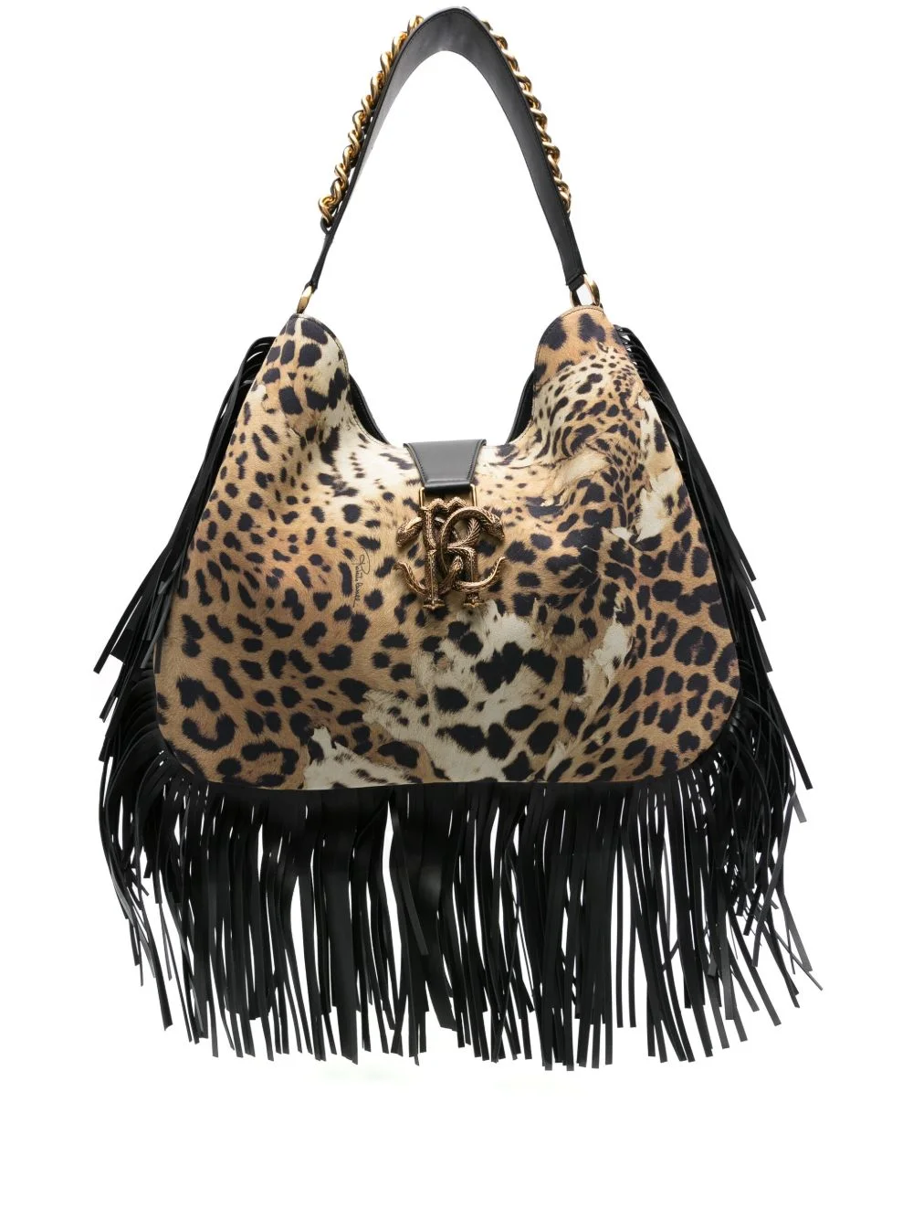 shoulder bag Highlights - Animalier brown/black - All-over jaguar skin print - Open top - Foldover top with magnetic fastening - Monogram rc detail - Fringe detailing - Leather and chain-link top handle - Main compartment - Internal zip-fastening pocket - Full lining Made in Italy Composition Suede 100% SIZE & FIT Measurement DEPTH 3.93 in(10 cm) HEIGHT 9.84 in(25 cm) STRAP 20.07 in(51 cm) WIDTH 15.74 in(40 cm)