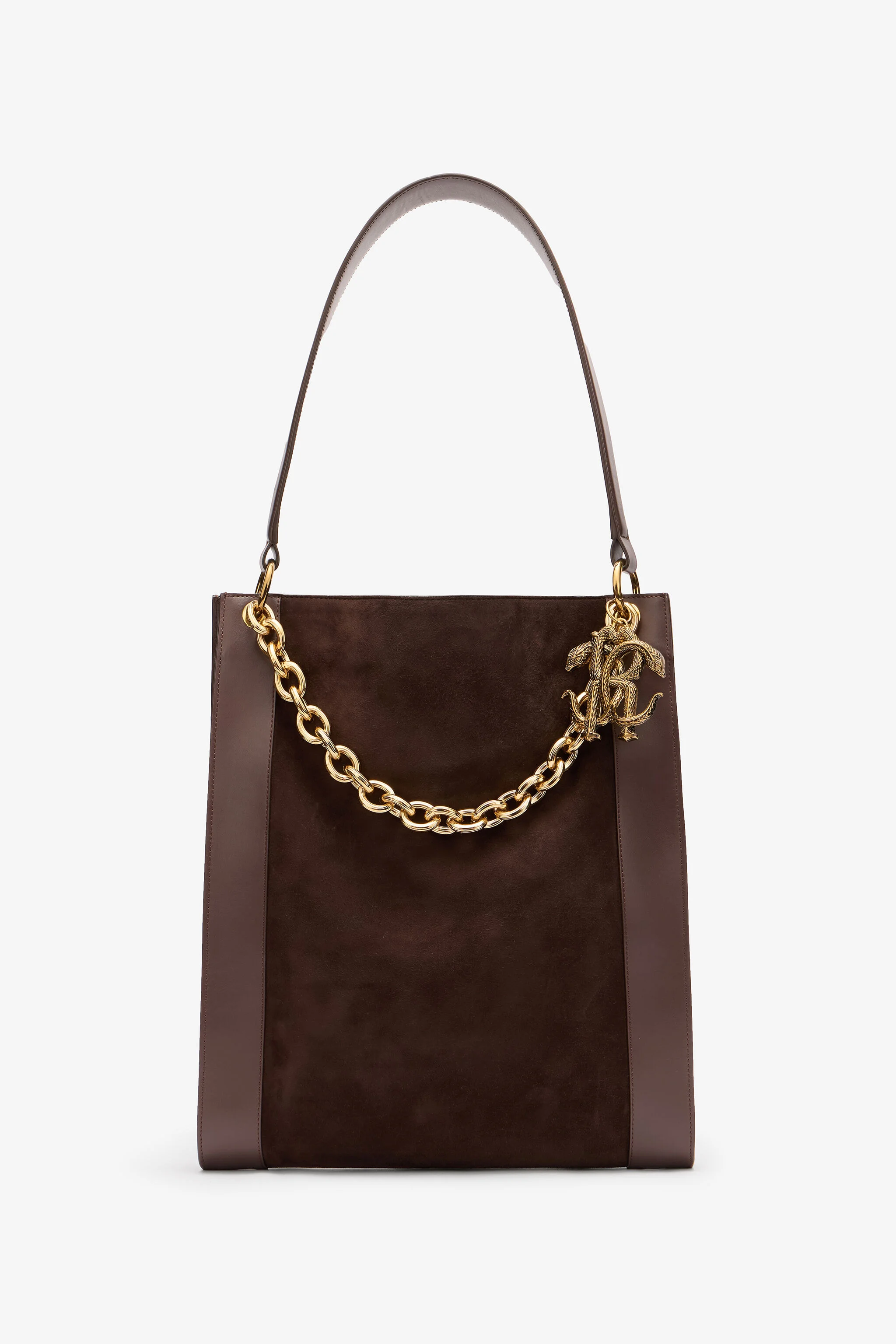 ID: VKB005-PC219-01660 The perfect combination of elegance and functionality, this shoulder bag by Roberto Cavalli will bring a touch of luxury to your everyday looks. The style, characterized by a spacious silhouette that extends vertically, plays on the contrast of textures created by the smooth side panels and the central panels with a suede effect. The accessory is complete with a convenient top handle and is enriched by a chain with thick links, embellished with a charm with the iconic Mirror Snake Monogram, which lends itself both to falling on the front in the form of a decorative element, and to being used as a second handle. Details - Large shoulder bag - Spacious design - Vertical rectangular design - Smooth-textured side panels - Central panel with suede texture - Top handle - Decorative chain to be used as a handle - Charm with Mirror Snake Monogram - Top opening - Contrasting animal print lining