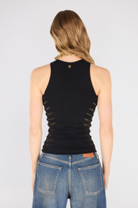 ID: UKT613-MA001-05051 A perfect combination of comfort and elegance, this Roberto Cavalli halterneck vest top features a bold openwork Zebra motif that extends along the sides of the garment, an authentic tribute to the stylistic codes that have always distinguished the Maison's aesthetics. Details - Sleeveless halterneck vest top - Crew neck - Openwork zebra design - Roberto Cavalli label on the inside collar - Made in Italy Care & maintenance External fabric:83% Polybutylene terephthalate, 17% Elastane