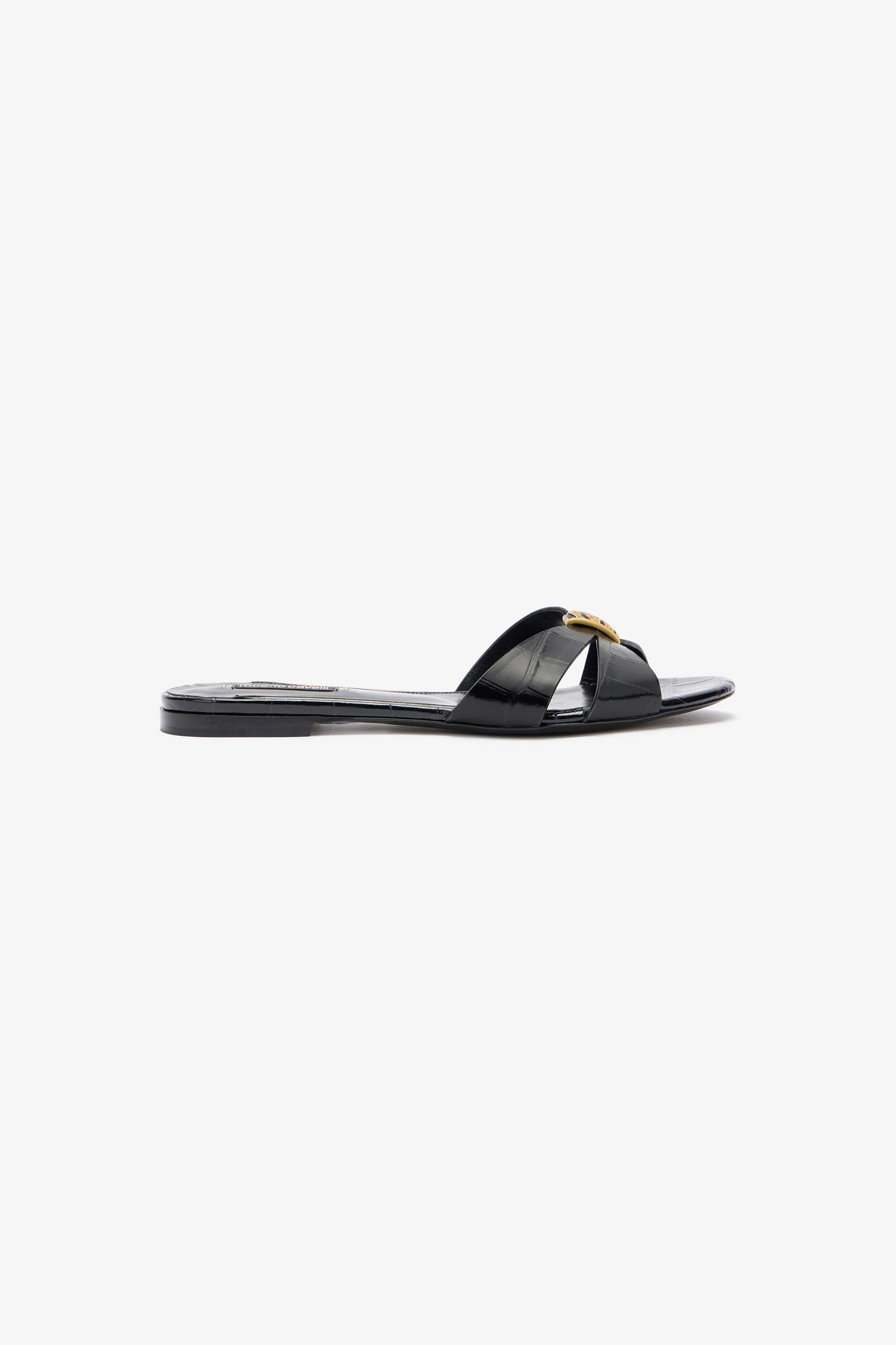 ID: VKS023-PZ579-05051 These slides-style low sandals feature a minimal and elegant design, embellished with front bands with refined crocodile scale-effect embossing, a symbol of the Roberto Cavalli DNA, which converge in a precious jewel detail with a crystal-studded motif. Details - Slider-style sandals - Crocodile scale-effect front bands - Central detail with crystals - Roberto Cavalli label on the insoles - Low heels