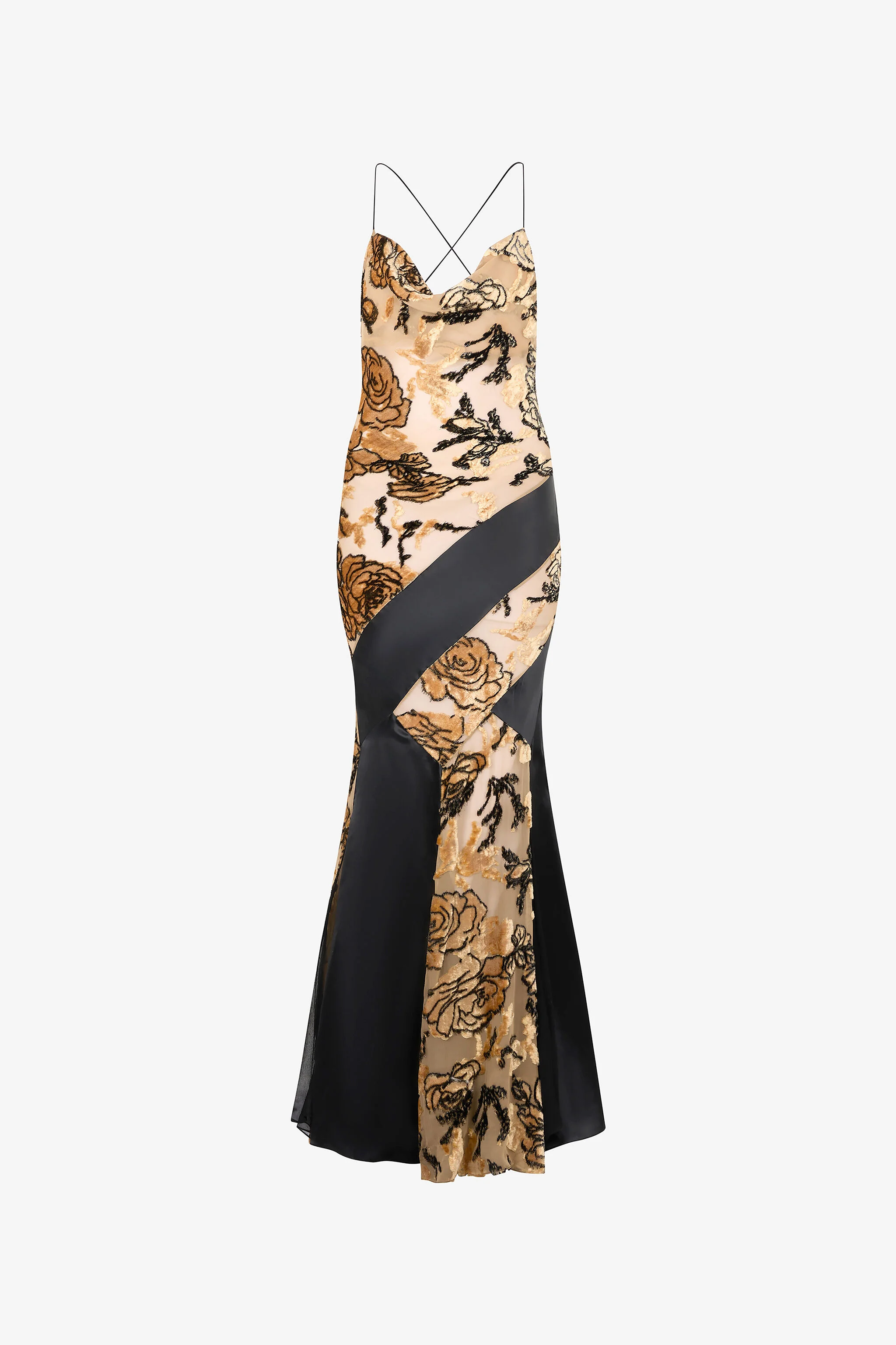 ID: VKT127-FC008-D0394 This long slip dress-inspired gown stands out for its soft lines and a romantic all-over rose pattern, accented by an elegant silk band that climbs up from the hem and wraps around the hips. The see-through effect, the thin crossed straps at the back and the refined cascading neckline further enrich the garment with a touch of sensuality and opulent elegance. Details - Silk-blend slip dress - All-over rose motif - Fitted cut with flared hem - Slim crossover straps at the back - Backless - Cascading neckline