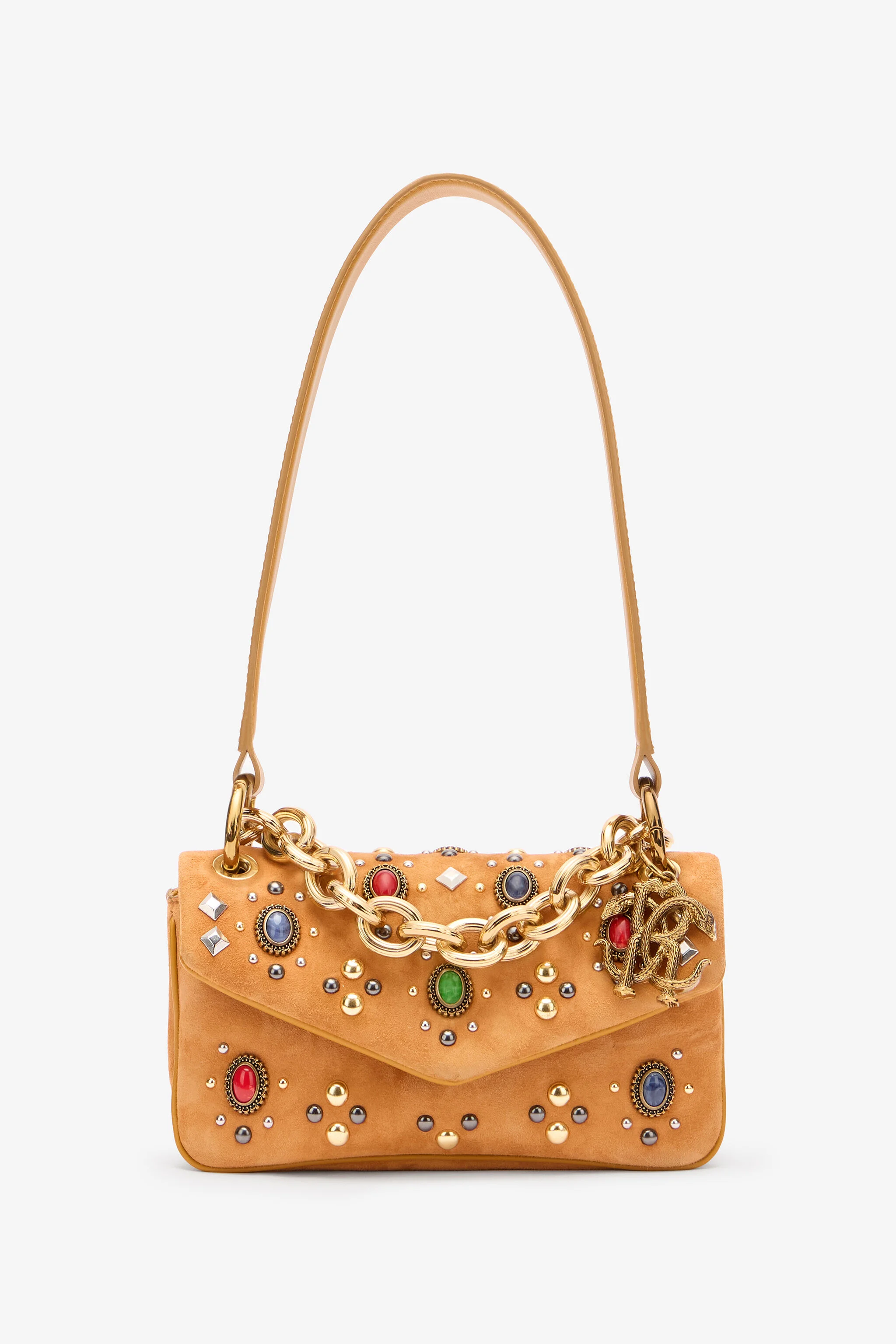ID: VKB017-PC003-01004 Maximalist aesthetics on a compact scale: this is how Roberto Cavalli expresses its creativity in this shoulder bag, featuring a gusseted construction that creates two spacious interior compartments, and a soft suede texture decorated with colorful stones alternating with studs in various shapes and finishes. The accessory is equipped with a matching top handle and a chain with thick links, embellished with a charm with the iconic Mirror Snake Monogram, which lends itself both to falling on the front in the form of a decorative element and to being used as a second handle. Details - Suede-effect bag - Rectangular design with gusseted side panels - Small size - Decoration with colored stones and studs - Flap with magnetic button - Decorative chain to be used as a handle - Top handle - Charm with Mirror Snake Monogram - Can be carried over the shoulder or by hand - Two internal compartments