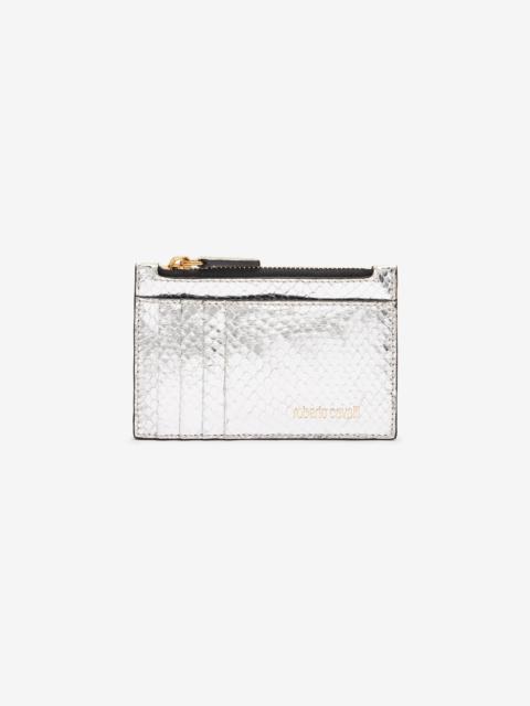 ID: TKA005-PZ579-D0007 This bold and sophisticated coin purse in fine snake scale-effect leather is an authentic tribute to the Maison's distinctive style, which is also represented by the Roberto Cavalli logo on the front. The rectangular design with top zipper fastening is complemented by card and document compartments on the front. Details - Coin purse with Roberto Cavalli logo - Made from leather with snake-scale effect - Lined interior - Top fastening with zipper - Card and document slots on front Care & maintenance Leather - Fur:Aegagrus Hircus / Lining:100% Viscose / Rayon