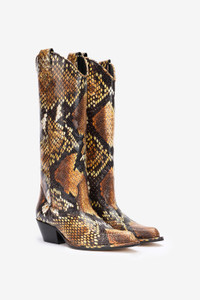 ID: UWS001-PN053-09004 Crafted from soft leather, these Texan boots from Roberto Cavalli are a tribute to the elegance of the reptilian world that has always held allure for the brand. In fact, this style is distinguished by the Python print with an all-over snake scale-effect texture and the iconic Mirror Snake Monogram that decorates the bands on the top of the leg in the form of a golden applique. Details - Leather boots with Python print and snake scale-effect texture - Slightly square toe design - Mirror Snake Monogram on the bands at the top of the leg - Stacked Cuban heel - Leather sole - Leather-lined interior Care & maintenance Lining:100% Bos Taurus / Outer sole:100% Bos Taurus / Upper:100% Ovis Aries Aries