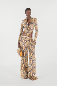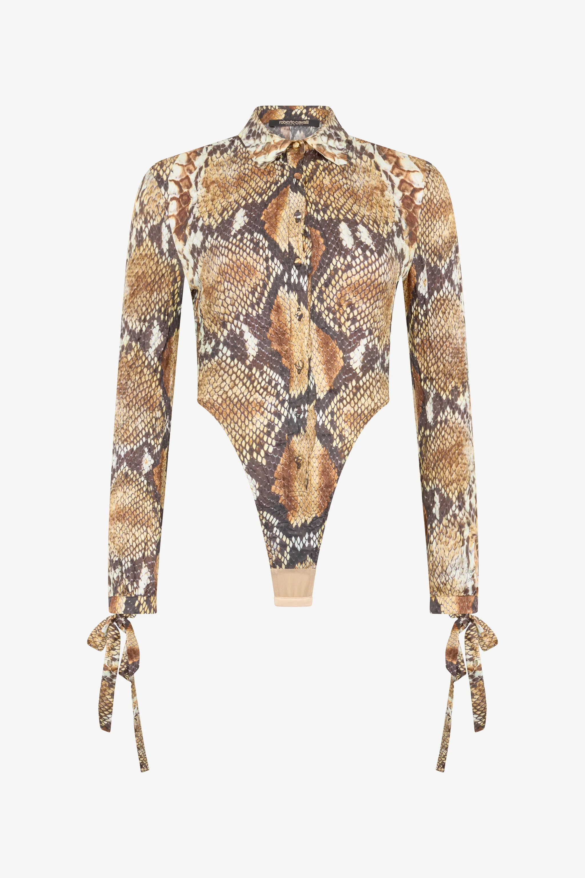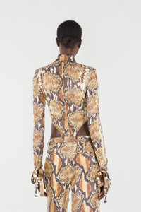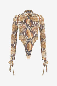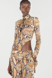 ID: UWT706-4QN93-J0256 This Python print shirt bodysuit adds a bold and sophisticated touch to your wardrobe. The animal print, a timeless classic, is perfect for creating original and trendy looks. Ideal for wearing both day and night, this garment enhances the silhouette with elegance. The model is 178 cm tall and wears size S / 40. Details - Python print shirt bodysuit - Front button closure - Long sleeves with tie cuffs - Made in: Italy - Perfect for a bold and fashionable look, ideal with high-waisted trousers or an elegant skirt. - Wear with minimal accessories for a sophisticated outfit. Care & maintenance External fabric:100% Silk / Secondary fabric:87% Polybutylene terephthalate, 13% Elastodiene