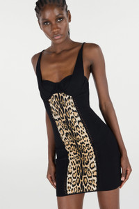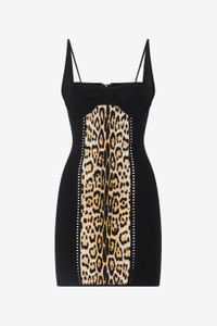 ID: VKM104-MI009-05571 The soft cut of this mini dress by Roberto Cavalli is enriched by details that recall the animal universe, which has always been the inspiration for the Maison. The model, crafted from stretch fabric, stands out due to its structured bra-like detail on the decolletage and the front Jaguar Skin pattern in jacquard, flanked by an elegant openwork design. Details - Stretch fabric mini dress - Front panel with openwork edges and Jaguar Skin jacquard pattern - Bra-effect decolletage - Sleeveless design - Fitted lines - Spaghetti straps - Back zipper fastening