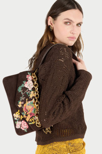 ID: VKB018-PC010-01660 A refined embroidery with flowering branches and pheasant is the undisputed protagonist of this rectangular bag by Roberto Cavalli, featuring a refined suede texture and a construction with side panels that creates two internal compartments. The accessory is complete with a convenient top handle and is enriched by a chain with thick links, embellished with a charm with the iconic Mirror Snake Monogram, which lends itself both to falling on the front in the form of a decorative element, and to being used as a second handle. Details - Suede shoulder bag - Embroidery with flowering branches and pheasant on the front - Rectangular design with gusseted side panels - Top handle - Decorative chain to be used as a handle - Charm with Mirror Snake Monogram - Two internal compartments - Inner lining with Cheetah Skin print
