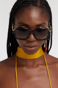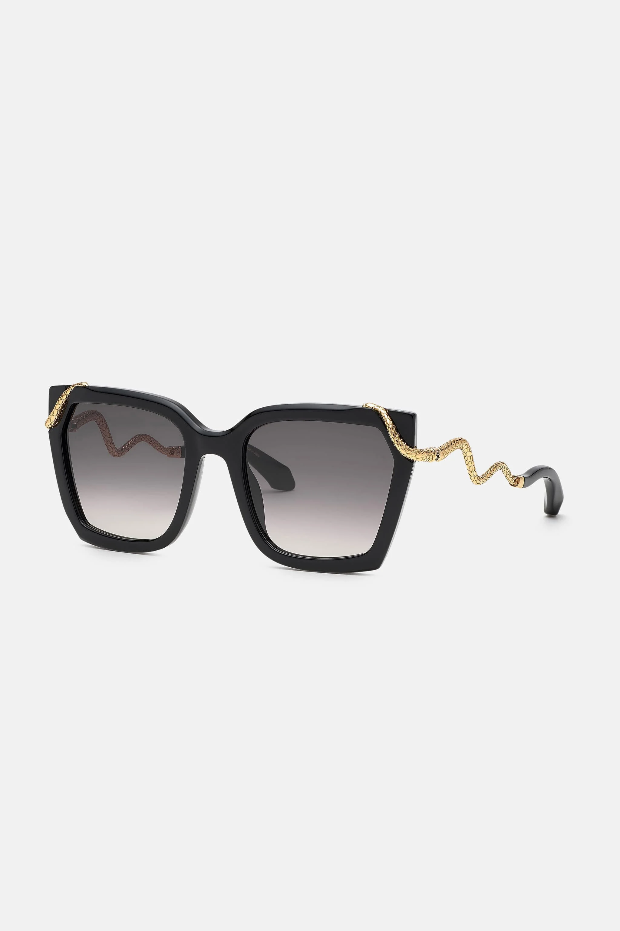 ID: RALD76-ID079-D9889 One of Roberto Cavalli's favorite motifs, the Snake, represented by the metal temples of this styles, designed to wrap around part of the acetate front. The head of the snakes is perfectly reproduced with details. The temples tip – realized with a particular technique using a crystal acetate – shows the whole construction of the temple, an entire snake from head to tail. Details - Sunglasses with wide rectangular shape of the front, logo on the temples - Snake Collection - Monogram RC on the temple tip - Made in Italy - Lenses 56mm Bridge 21mm Temples 140mm Care & maintenance External fabric:30% Polyester, 30% Acetato, 25% Nichel, 15% Polyamide