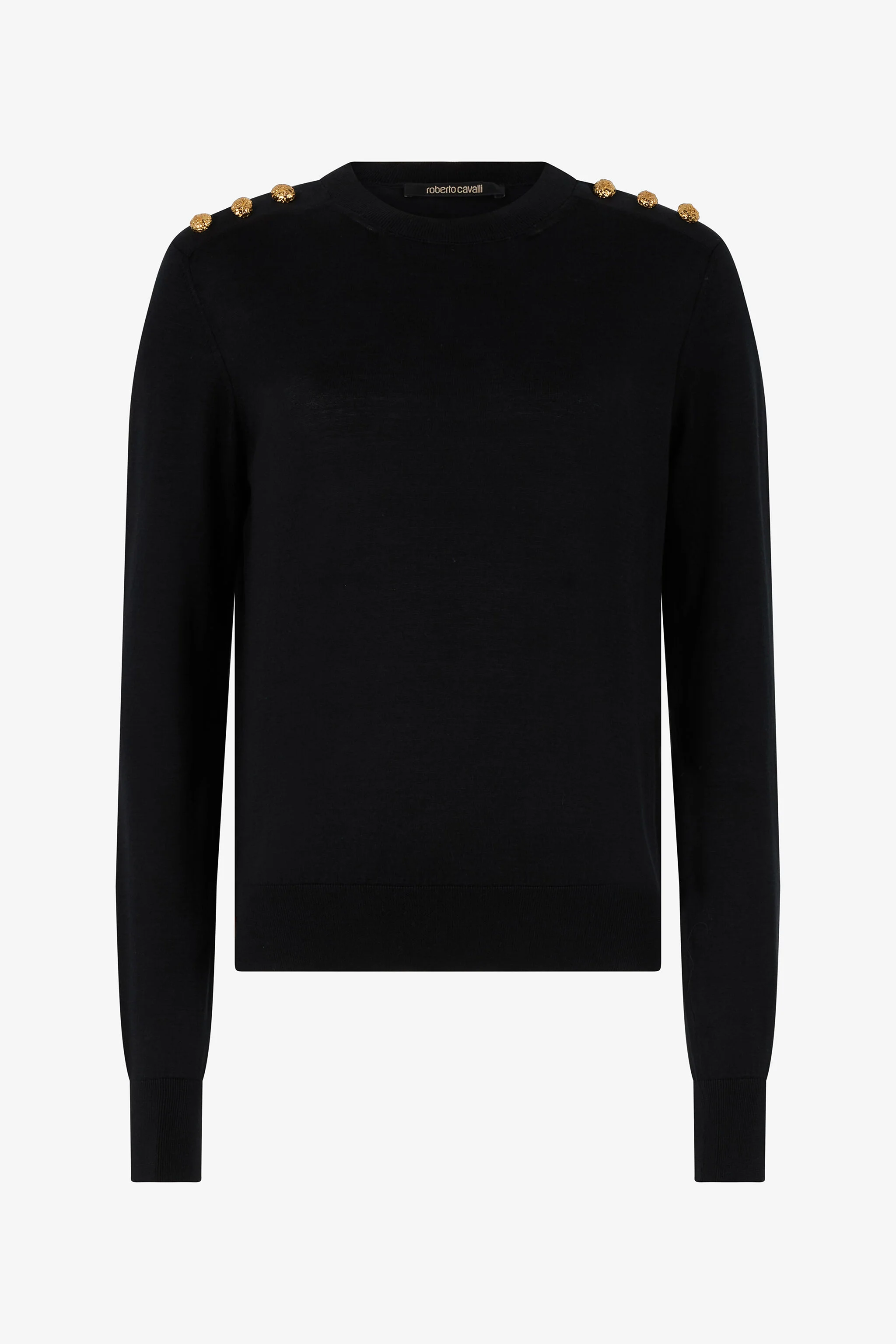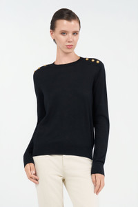 ID: UWM610-WH003-05051 Designed for those who appreciate understated elegance, this wool sweater stands out with its gold buttons on the shoulders. The soft knit and classic cut ensure timeless comfort, making it a versatile piece for any season and occasion. Details - Sweater made from premium wool - Decorative gold buttons - Classic and versatile fit - Deep black color - Ideal for any season