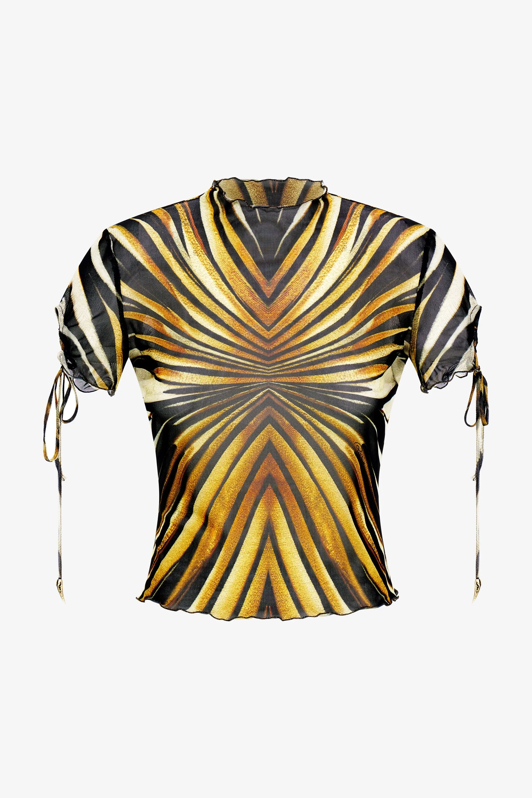 ID: TKT613-6HM33-01080 Illuminate your look with the Ray of Gold T-shirt, where hypnotic lines converge in a radiant display of golden hues and deep black. The fitted silhouette is enhanced by delicate ruffled edges at the high neck and hem, while drawstring details add a playful touch to the short sleeves. This piece embodies contemporary Cavalli allure. The model is 178 cm / 5'10" tall and wears size S / 40 IT. Details - Fitted T-shirt design - High neck with ruffle trim - Short sleeves with adjustable drawstrings and ruffle cuffs - Ruffled hemline - All-over Ray of Gold print - Ideal for statement daytime looks or evening ensembles - Pair with black trousers or a sleek skirt to let the print shine - Made in Italy Care & maintenance External fabric:95% Polyester, 5% Elastane
