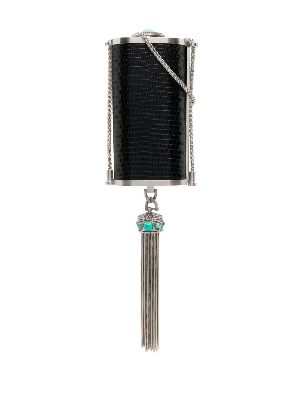 tassel-detail shoulder bag Highlights - Black - Calf leather - Embossed finish - Metal tassel detail - Gemstone detailing - Silver-tone hardware - Sliding chain-link shoulder strap - Top clasp fastening - Main compartment Made in Italy Composition Outer: Bos Taurus 100% Lining: Viscose 68%, Ramie 32% SIZE & FIT Model measurements Height 5 ft 11 in(1.8 m) Bust/Chest 31.49 in(80 cm) Hips 36.61 in(93 cm) Waist 24.4 in(62 cm) Measurement DEPTH 1.96 in(5 cm) HEIGHT 6.69 in(17 cm) STRAP 17.71 in(45 cm) WIDTH 3.14 in(8 cm)