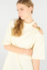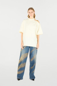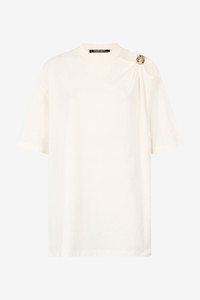 ID: UKT63A-JD030-09088 This pure cotton T-shirt by Roberto Cavalli features an essential silhouette that takes on character thanks to the eye-catching cut-out on the shoulder, complete with a jewel roaring tiger head, an authentic tribute to the Maison's feline spirit. Details - Pure cotton T-shirt - Crew neck - Half sleeves - Cut-out on the shoulder with bejeweled tiger head - Roberto Cavalli label on the inside collar - Made in Italy Care & maintenance External fabric:100% Cotton / Secondary fabric:100% Cotton