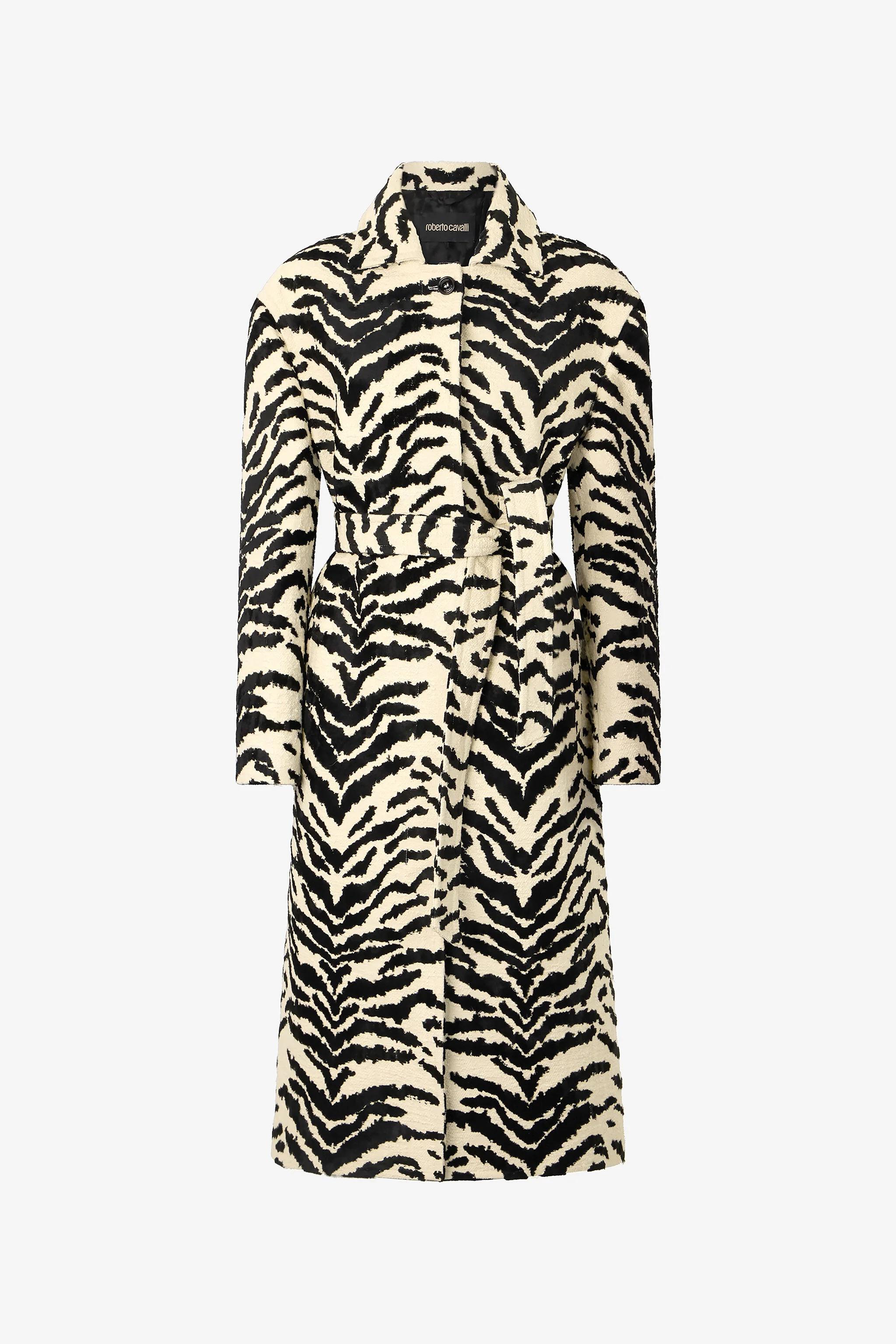 ID: UKT504-DJ088-D0027 Feline elegance, which has always been a source of inspiration for Roberto Cavalli, is at the heart of this long classic belted thanks to the roaring White Tigress print that extends over the entire surface of the garment. Details - Coat with White Tigress print - Classic collar - Tie waist belt - Concealed single-breasted fastening with exposed top button - Roberto Cavalli label on the inside collar Care & maintenance External fabric:76% Cotton, 19% Acrylic, 5% Viscose / Rayon / Lining:100% Viscose / Rayon