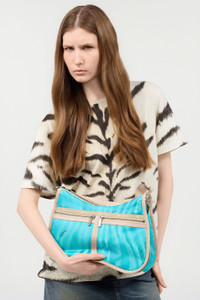 ID: ULL005-IL017-E0511 The refined Torino bag features an elegant silhouette with a slightly wavy base and an eye-catching print that extends over the entire surface and features some small details with the Roberto Cavalli signature. The accessory, finished with a customized front insert and the iconic tiger Fang charm, is equipped with two convenient front pockets with zip, perfect for storing your belongings, and a top handle in adjustable ribbon that allows it to be worn in customized ways. Details - Bag with wavy base - All-over print with small Roberto Cavalli signatures - Front insert with LeSportsac logo - One front pocket with LeSportsac branded pull-tab - One front pocket with Roberto Cavalli branded pull-tab - Adjustable ribbon handle - Tiger Fang charm attached to the handle - Can be carried over the shoulder - Side zips to expand the volume - Two main compartments with zip fastening - Interior wall pocket with zipper - Lined interior - Dimensions (H x W x D): 19 x 35.6 x 12.7 (18.5 thick) cm / 7.5 x 14 x 5 (7.25 thick) inches - The model is part of a collaboration between Roberto Cavalli and LeSportsac Care & maintenance External fabric:100% Polyester / Secondary fabric:100% Polyurethane / Lining:100% Polyester