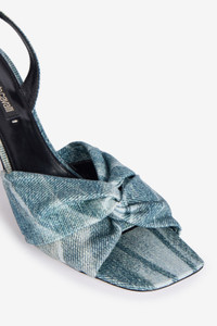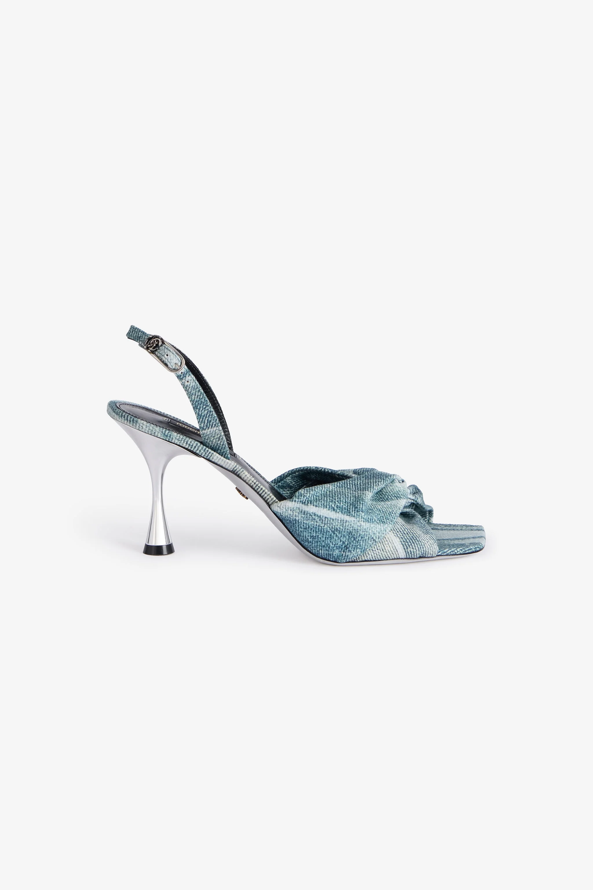 ID: UKS006-SMC77-D3570 An emblem of contemporary elegance in the purest style of the Maison, these slingback sandals with spool heel and sophisticated contrasting sole feature a square-toe design and a refined cotton upper with a knotted effect and a motif that reproduces the denim fabric. The shoe is further refined with the Mirror Snake Monogram on the strap buckle, the Roberto Cavalli logo on the insole and the metallic RC Monogram with the brand's lettering on the sole. Details - Denim-effect cotton slingback sandals - Square toe design - Knotted detail on the front - Mirror Snake Monogram on the strap buckle - Leather-lined insole with Roberto Cavalli logo - Leather sole with metallic RC Monogram and Roberto Cavalli logo - Mid-height spool heel Care & maintenance Lining:100% Capra hircus linneaus / Outer sole:100% Bos Taurus / Upper:100% Cotton