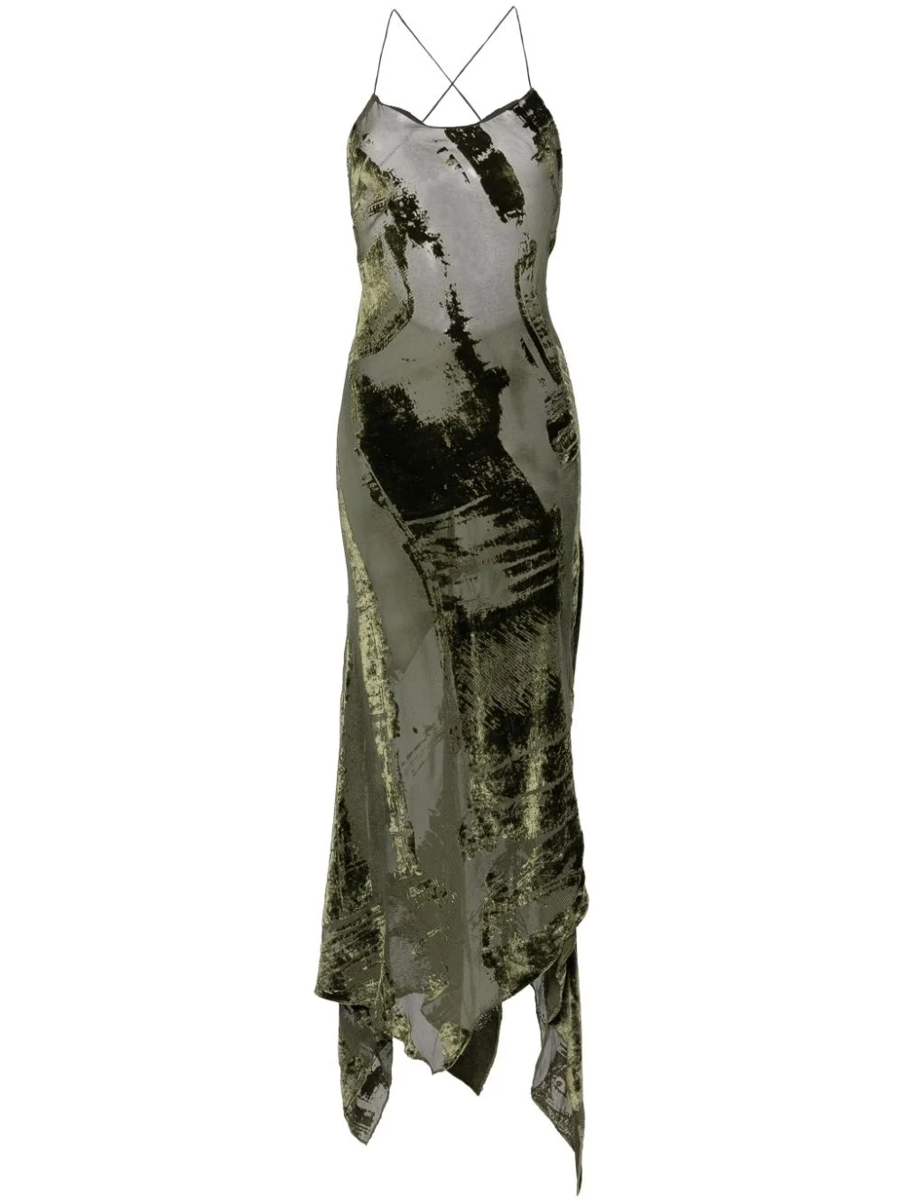 velvet devore maxi dress Highlights - Olive green - Devore effect - Velvet finish - Sheer panels - Square neck - Spaghetti straps - Rear criss-cross straps - Open back - Unlined - Handkerchief hem - Maxi Made in Italy Composition Outer: Viscose 61%, Silk 39% Lining: Silk 100% SIZE & FIT Model measurements Height 5 ft 10 in(1.78 m) Bust/Chest 33.46 in(85 cm) Hips 36.22 in(92 cm) Waist 23.22 in(59 cm) FittingInformation Designed for a slim fit that sits just away from the body offering a close yet comfortable fit Made from a lightweight non-stretch fabric This piece fits true to size – take your usual size