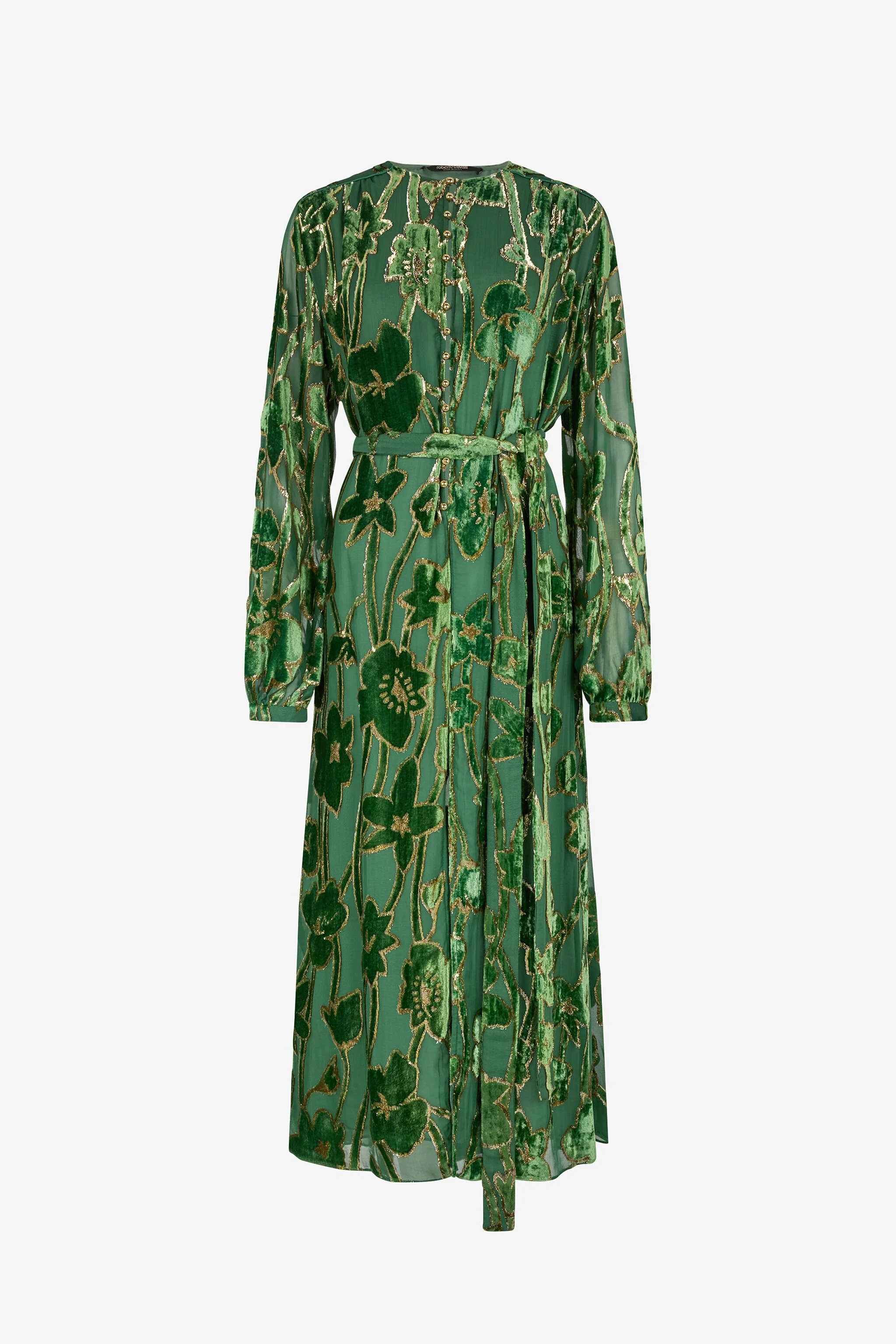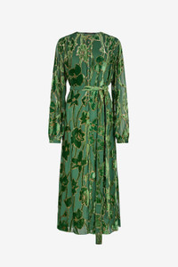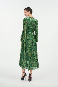 ID: VKT122-FC007-D0112 A masterpiece of texture and light, this dress captures the essence of sophisticated femininity. Lush green velvet blossoms across a sheer, flowing silhouette, traced with shimmering gold threads that catch the light with every movement. The design gracefully defines the figure with a self-tie belt, while a daring front slit offers a glimpse of allure. It's an unforgettable statement of romantic elegance, designed for moments that matter. The model is 178 cm tall and wears size S / 40 IT. Details - Midi dress with long sleeves and a self-tie belt to accentuate the waist - Crafted from a precious viscose and silk blend with a luxurious silk lining - Features an intricate floral velvet devore pattern with luminous thread details - Delicate button fastening along the front - A fluid skirt with a high front slit adds elegant movement - Perfect for exclusive evening events, elegant dinners, or sophisticated ceremonies - Complete the look with heeled sandals and minimalist gold jewellery - Made in Italy