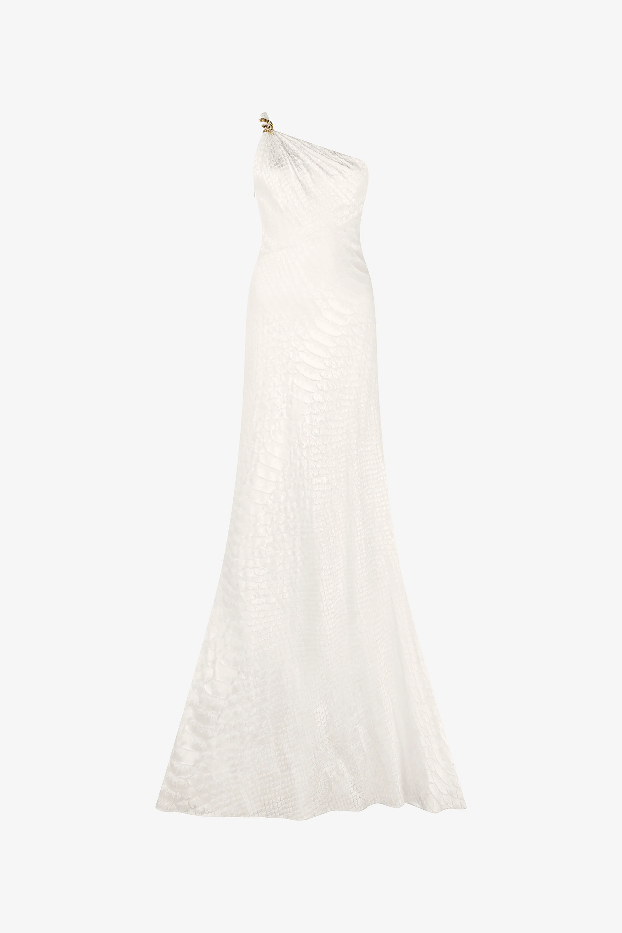 ID: WWT121-HES36-00052 Crafted from a fluid silk blend, this extra-long dress combines Roberto Cavalli’s signature evening elegance with the fierce animalier spirit that has always defined the Maison. The one-shoulder design stands out with its delicate all-over scale-effect print and a sinuous gold-tone metal serpent that coils around the twisted strap. Details - Extra-long silk-blend dress - All-over scale-effect print - Metal snake detail with engraved finish - Fluid silhouette with flared hem - One-shoulder design with twisted torchon-style strap - Side zip fastening