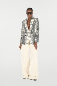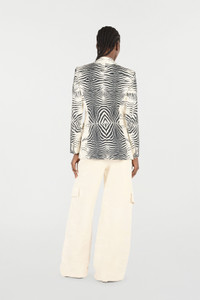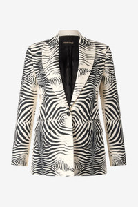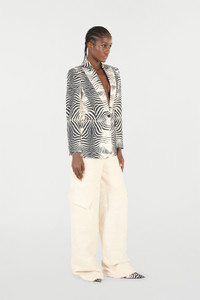 ID: UKT401-ORN49-D0027 Feline elegance, which has always been a source of inspiration for Roberto Cavalli, is expressed in this single-breasted blazer through a roaring all-over White Tigress print and the iconic solid-color Jaguar Skin print on the lining. The model is completed by the pointed lapels, the flap front pockets and the back vent. Details - Blazer with White Tigress print - Lining with solid-color Jaguar Skin print - Pointed lapels - Roberto Cavalli label on the inside collar - Single-breasted fastening with one button - Two front pockets with flap - Cuffs with buttons - Single-breasted button fastening - Back vent Care & maintenance External fabric:96% Viscose / Rayon, 4% Elastane / Lining:100% Viscose / Rayon