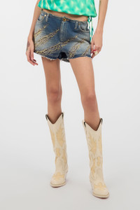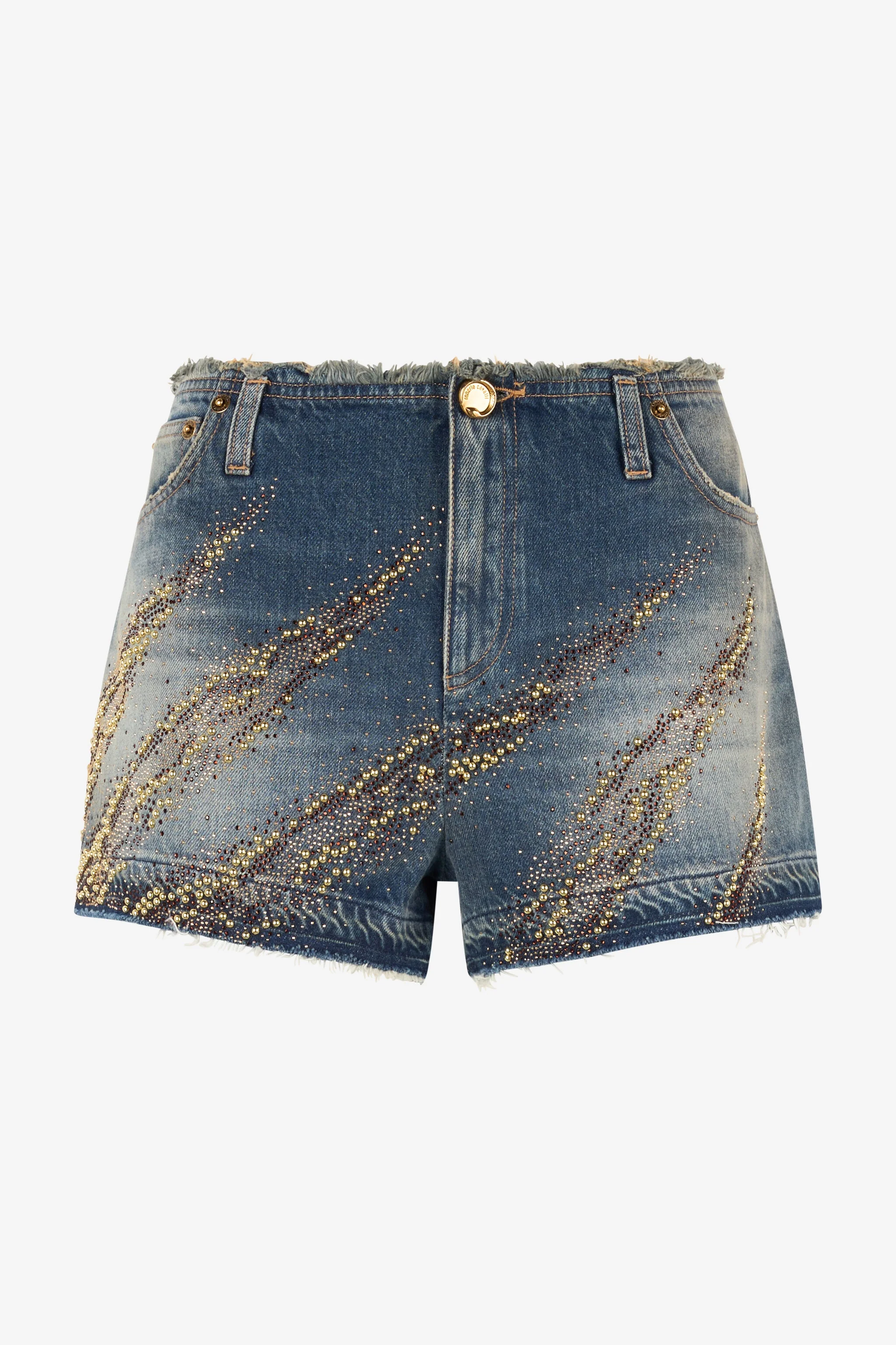 ID: UKJ241-VT007-04564 These pure cotton denim shorts from Roberto Cavalli feature distressed-effect details, such as a slightly frayed waist and the raw-cut hem. The real star of the style, however, is the Zebra motif, formed by shiny rhinestones and bejeweled studs of different sizes, which stand out boldly all over. Details - Pure cotton denim shorts - Cotton lining - Bejeweled studded and rhinestone-detailed zebra design - Slightly frayed waist - Belt loops - Raw-cut hem - Roberto Cavalli logo label on the back - Zipper and branded button with snake fastening Care & maintenance External fabric:100% Cotton / Lining:100% Cotton