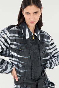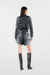 ID: UKT163-4QN50-D0146 This contemporary short pure silk dress features the Zebra pattern, one of Roberto Cavalli's iconic prints, over the entire surface of the garment, updated with a distinctive terry effect. The piece is further embellished by several details that attest to the brand's attention to detail, such as the Mirror Snake Monogram pull-tab, the bejeweled buttons on the flap of the maxi-pockets and on the cuffs, and the removable belt that ties on the waist to enhance the silhouette. Details - Short pure silk dress - All-over terry-effect Zebra print - Roberto Cavalli signature all over the piece - Pointed collar - Long sleeves - Breast pockets with flap and button - Side pockets with flap, button and top opening - Bejeweled buttons on the cuffs and pocket flaps - Front zip fastening and pull-tab with Mirror Snake Monogram - Removable matching belt - Roberto Cavalli label on the inside collar - Made in Italy Care & maintenance External fabric:100% Silk