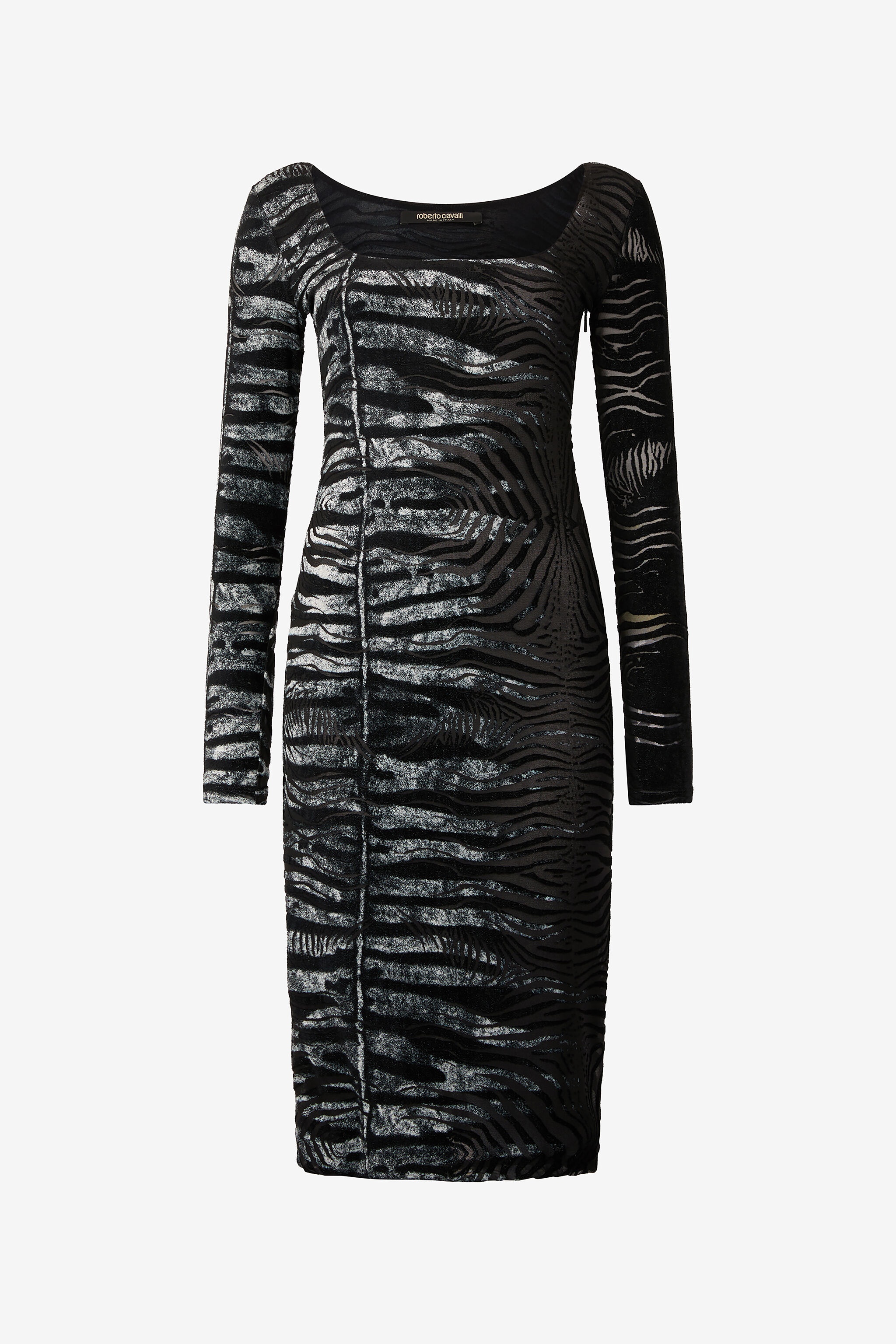 ID: UKT148-CPN50-D0146 Add a touch of wild elegance to your closet with this knee-length dress from Roberto Cavalli featuring refined contrasting detailing. The protagonists of the piece are actually the iconic Zebra motif with a special terry effect on one half and the striking Tiger Skin motif on the other half, which give the texture a sensual see-through effect. Details - Knee-length dress - Terry-effect zebra motif and see-through Tiger Skin motif - Lined - Slightly square neck - Long sleeves - Roberto Cavalli label on the inside collar - Made in Italy Care & maintenance External fabric:69% Viscose / Rayon, 31% Polyester / Lining:100% Polybutylene terephthalate