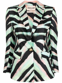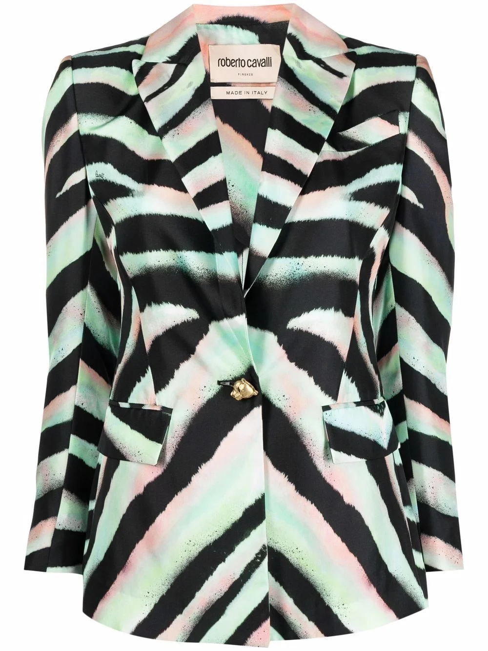zebra-print silk blazer Roberto Cavalli puts a playful spin on its favoured zebra print, by designing it with turquoise and pink accents. The silk blazer is finished with a single button fastening, in the shape of the brand's signature Panther Head. Made in Italy Composition Silk 100% SIZE & FIT Model measurements Height 5 ft 9 in(1.75 m) Bust/Chest 34.64 in(88 cm) Hips 36.61 in(93 cm) Waist 26.37 in(67 cm)