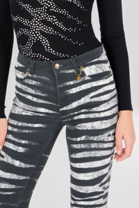 ID: UKJ221-DAN50-D0146 The Zebra print, one of the hallmarks of the Roberto Cavalli universe, is the undisputed star of these bold pants with a flared design and frayed hem. The garment is embellished with an elegant golden charm with RC Monogram on one of the belt loops. Details - Stretch cotton pants with Zebra print - Five-pocket design - Golden charm with RC Monogram on a belt loop - Flared leg - Slightly frayed hems - Branded tag on back - Lined model - Zipper and button fastening Care & maintenance External fabric:98% Cotton, 2% Elastane / Lining:65% Polyester, 35% Cotton