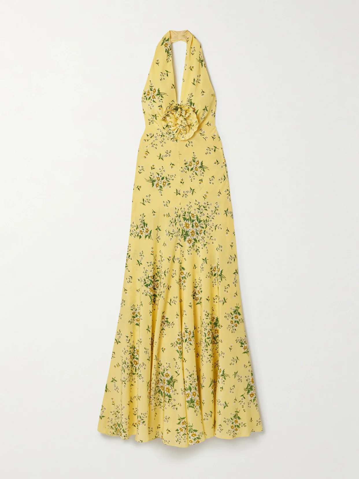 Rodarte's elegant gown is made from silk crepe de chine printed with daisies. It has a plunging halter neckline and is adorned with a detachable flower at the chest.