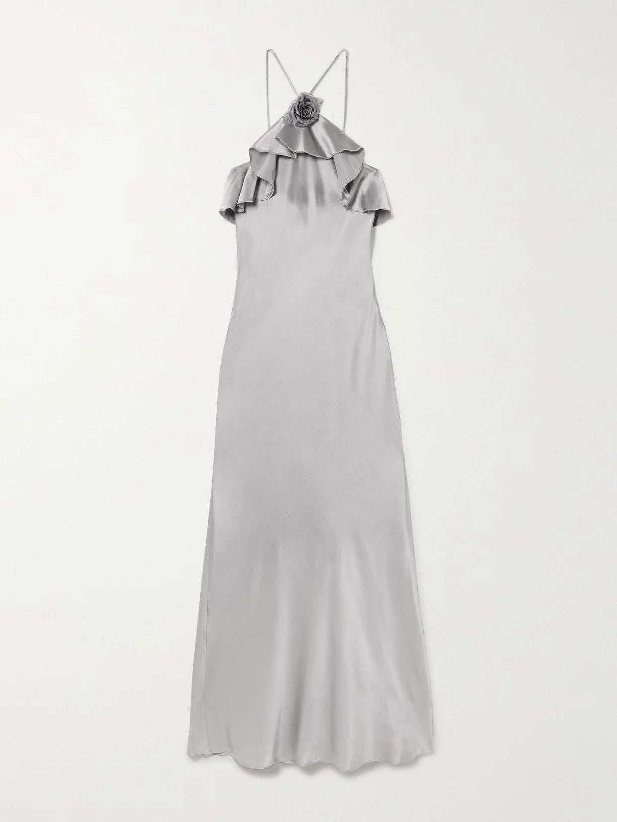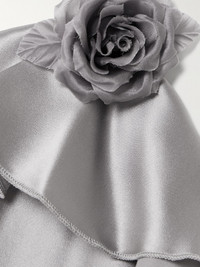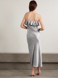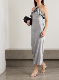 Rodarte's dress embodies true romanticism. Cut on the bias from glossy silk-satin, it's adorned with a floral applique and has ruffles tracing the neckline. The silver shade is the perfect base for vibrant accessories.