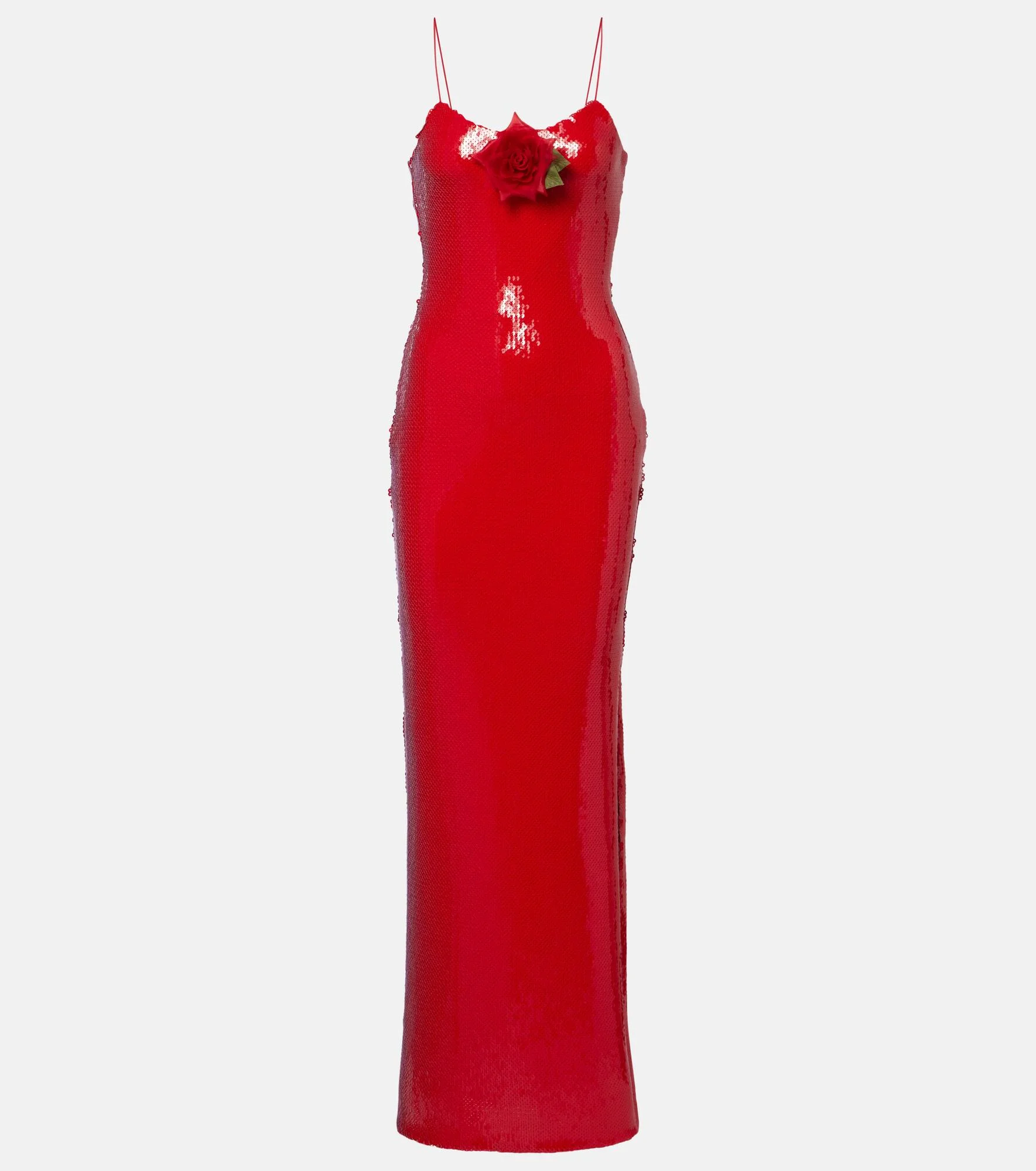 Rodarte puts romance and storytelling at the forefront of its grand and mesmerizing designs. Cut to an elegant, minimalist slip silhouette, this eye-catching gown is entirely covered in a layer of shimmering sequins and finished with a tonal floral applique. Product Details - Material: 100% polyester - Care instructions: dry clean - Made in the USA - Color: red - Designer color name: Red - Lining: 91.5% silk, 8.5% elastane - Trim: 100% silk - Includes: detachable charm - Closure: concealed zipped side - Side slits - Item number: P01117059 Size & Fit - Fits large to size - we recommend trying one size smaller - Low back - Fitted - Slightly stretchy fabric - slit length 59.0cm-23" - The model seen in the picture is 178cm-5'10" and wearing a size US 2