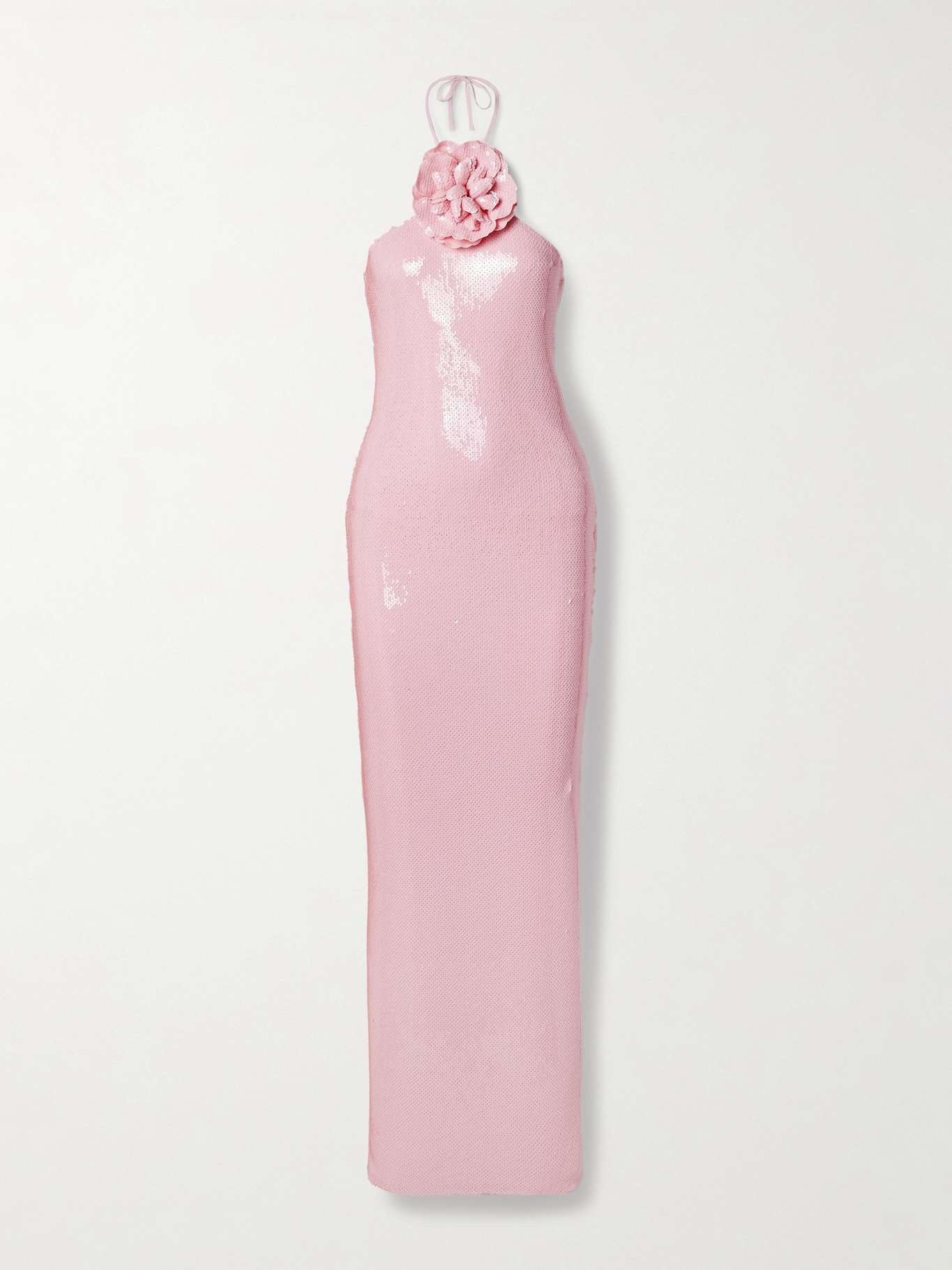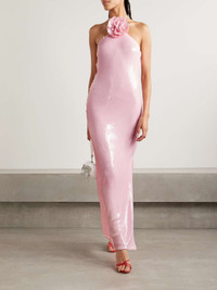 EDITORS'NOTES Rodarte's glamorous eveningwear always commands attention. This halterneck gown is cut for a slim fit from tulle drenched with sequins that give it a liquid-like shine. The crepe de chine lining ensures a smooth feel against the skin, while the side splits make it easy to move on the dance floor. SIZE & FIT - Fits true to size, take your normal size - Designed for a slim fit - Mid-weight, heavily embellished, stretchy fabric - Model is 177cm/ 5'10" and is wearing a US 2 DETAILS & CARE - Baby-pink sequined tulle - Ties at neck, concealed hook and zip fastening at side - 100% polyester; trim: 50% polyester, 50% silk; lining: 91.5% silk, 8.5% spandex - Specialist clean
