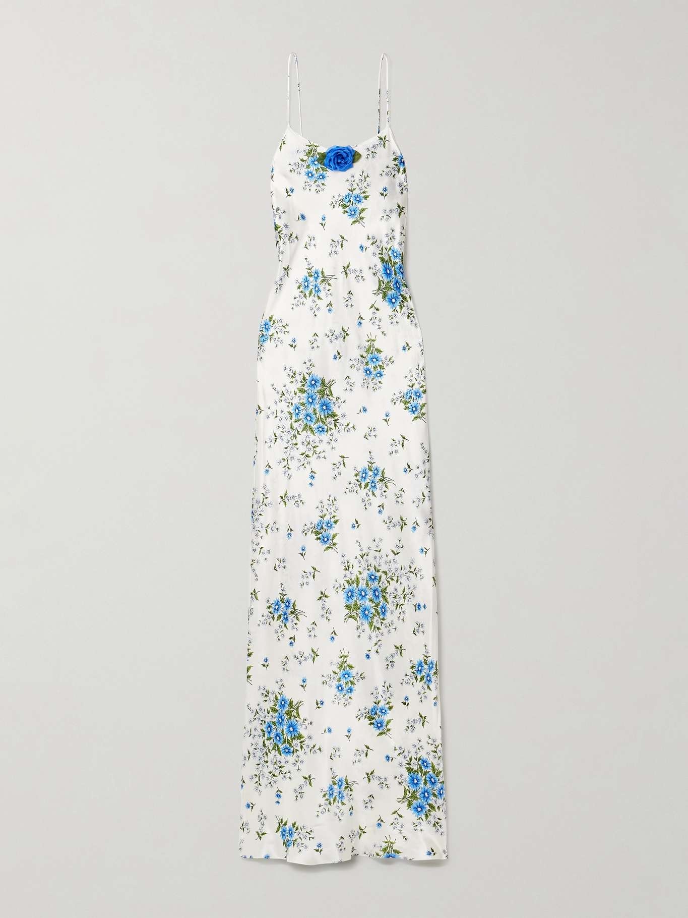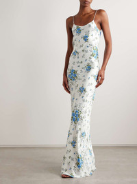 EDITORS'NOTES Rodarte's maxi dress is embellished with a single blue rose brooch that matches the flowers printed throughout - remove it for a more pared-back look. It's cut from fluid silk-satin and has adjustable, pin-thin straps. Wear yours with sandals and dainty jewelry. SIZE & FIT Model measurements: - Fits true to size, take your normal size - Designed for a slim fit - Lightweight, non-stretchy fabric - Model is 177cm/ 5'10" and is wearing a US 2 - Bust: 75cm/ 29.5" - Waist: 60cm/ 23.5" - Hip: 93cm/ 36.5" DETAILS & CARE - Multicolored silk-satin - Slips on - 100% silk - Dry clean