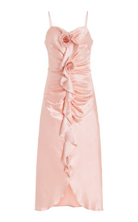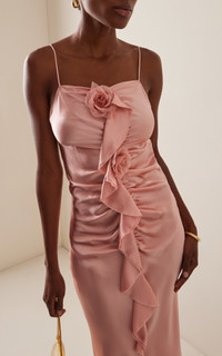 Flower-Detailed Ruched Silk-Satin Dress pink