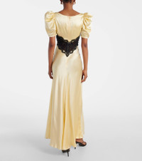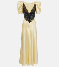 Rodarte puts romance and storytelling at the forefront of its grand and mesmerizing designs. Made from lustrous silk charmeuse, this gown is defined by a captivating, fitted lace bodice with a plunging neckline. Product Details - Material: 100% silk - Care instructions: dry clean - Made in the USA - Designer color name: Yellow - Item color: yellow, black - Trim: 75% cotton, 13% polyamide, 12% nylon - Lining: 100% nylon - Partially lined - Closure: zip and hook fastening - Item number: P01023684 Size & Fit - True to size - Oversized shoulders - Semi-sheer - Cinched waist - Non-stretchy fabric - The model seen in the picture is 178cm-5'10" and wearing a size US 4