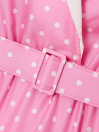 Rodarte's mini dress riffs on vintage styles in a playful way. Cut from polka-dot silk-twill, it has white notch lapels that frame the plunging wrap-effect neckline and puffy sleeves. The belt cinches the elasticated waist, while the skirt is pressed with soft pleats to create movement when you walk. Finish the look with point-toe pumps and statement earrings. Size & Fit - Fits true to size, take your normal size - Designed for a slightly loose fit, use the belt to cinch in at the waist - Particularly short in length - Lightweight, non-stretchy fabric - Model is 175cm/ 5'9" and is wearing a US 2 Model measurements: - Bust: 85cm/ 33.5” - Waist: 63cm/ 25” - Hip: 90cm/ 35.5” Details & Care - Pink and white silk-twill - Slips on - 100% silk - Dry clean
