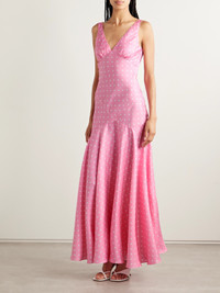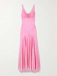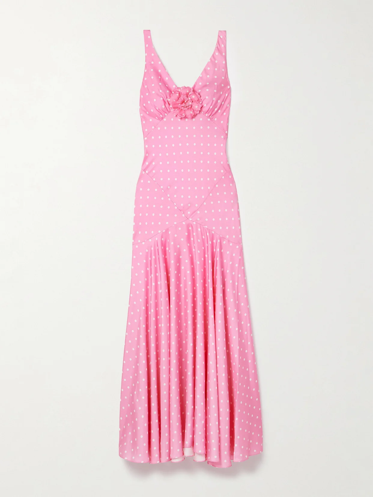 Rodarte's gown is reminiscent of romantic, vintage styles. Made from silk-satin twill, it's printed with classic polka-dots and has lightly gathered seamed cups and a flowy drop skirt. Detach the signature floral pin for a more pared-back look.