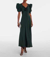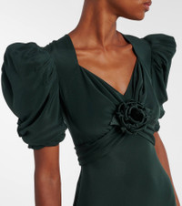 Rodarte puts romance and storytelling at the forefront of its grand and mesmerizing designs. Cut from lustrous silk charmeuse, this ankle-length cocktail dress features puff sleeves and a removable floral-applique accent on the front. Product Details - Material: 100% silk - Care instructions: dry clean - Made in the USA - Designer color name: Green - Item color: green - Collar: V-neck - Closure: concealed zipped back - Includes: detachable charm - Item number: P01103977 Size & Fit - True to size - Oversized shoulders - Fitted - Non-stretchy fabric - The model seen in the picture is 178cm-5'10" and wearing a size US 4