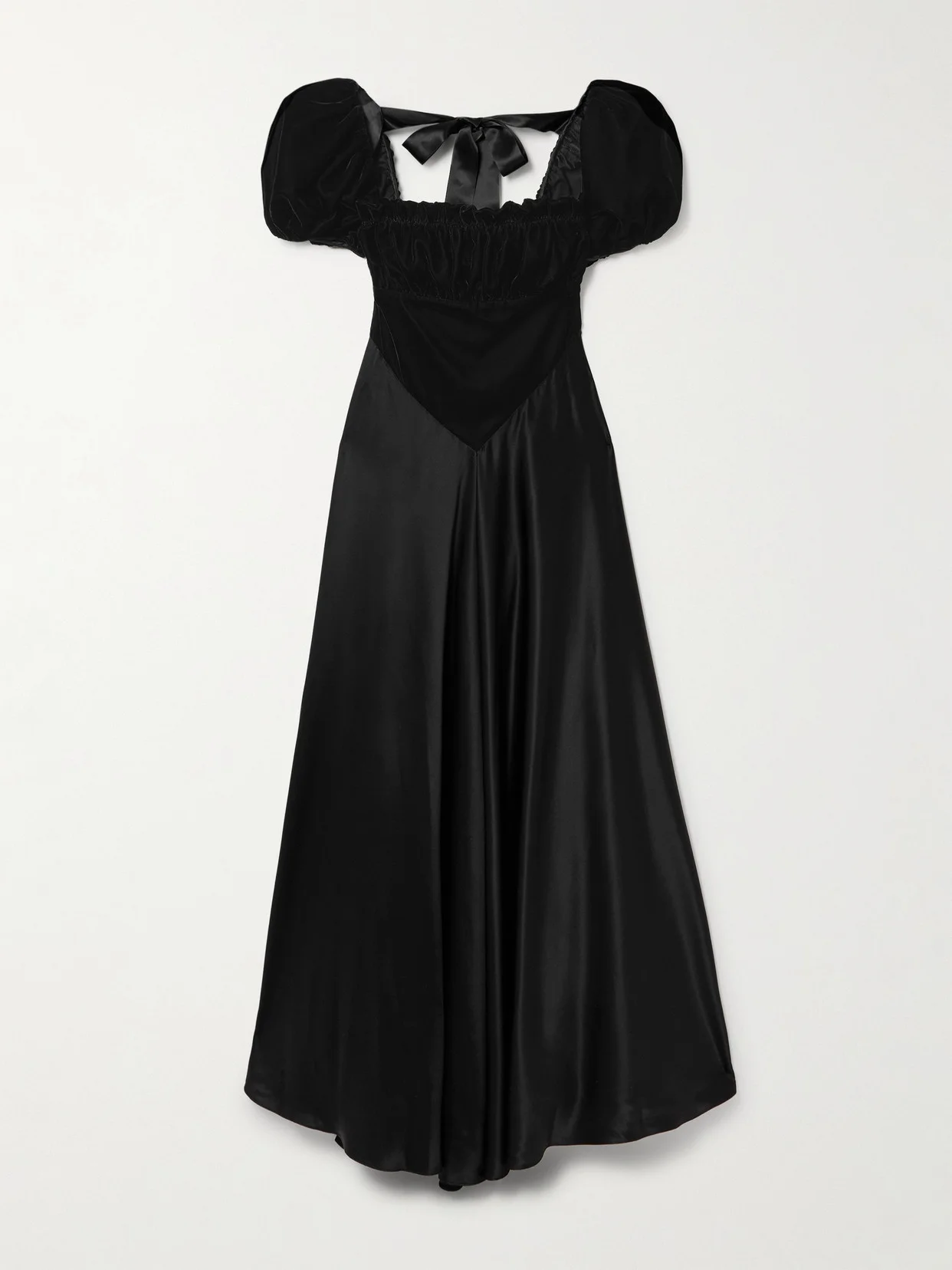 Rodarte's Fall '25 collection explores gothic romance, imagining each design as though it were under moonlight. This dress has a velvet bodice framed by puffed sleeves and a silk-satin midi skirt that moves beautifully. Turn in photos to showcase the pretty bow tied at the back.