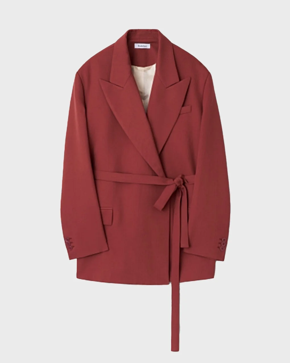 Blazer Stand Fluid by Rodebjer. This sleek blazer combines a fluid silhouette with a perfectly tailored fit, exemplifying Rodebjer’s elegant approach to tailoring. Made from a wool blend in a double-breasted design, it features classic details such as welt pockets, notched lapels, and a fully lined construction. The detachable waist belt cinches the waist, making it ideal to style with both wide-leg trousers and skirts. Size and Fit - Fits true to size, choose your usual size Specification - Article number - ID: 177061-320 - Brand: Rodebjer - Color: Rost - Washing Instructions: Dry clen - Made of: 55% Polyester, 54% Virgin Wool