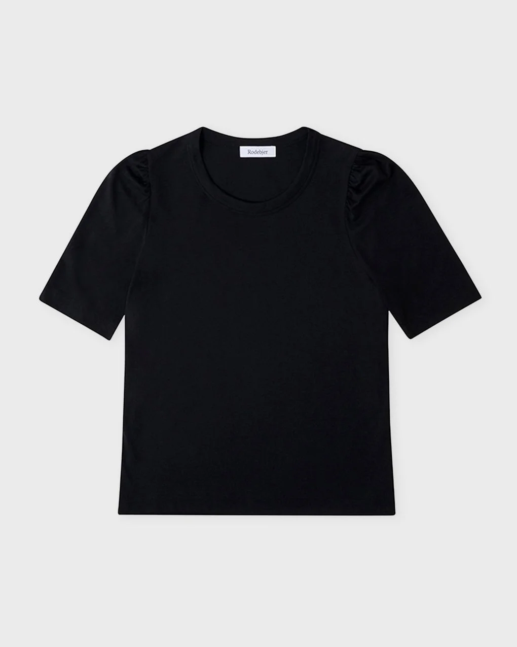 Top Dory from Rodebjer. Stylish t-shirt with short puff sleeves. The top is made in a soft material and is straight and slightly shorter in its model. Perfect complement to the base wardrobe. Comes in several different colors. Size and Fit - Runs a bit small in size, if you are between sizes please choose the larger one - Garment length: 59 cm - bust: 86 cm - sleeve length: 31 cm Specification - Article number - ID: 156861-000 - Brand: Rodebjer - Color: Black - Washing Instructions: Machine wash - Made of: Made of 67% Lyocell, 33% cotton