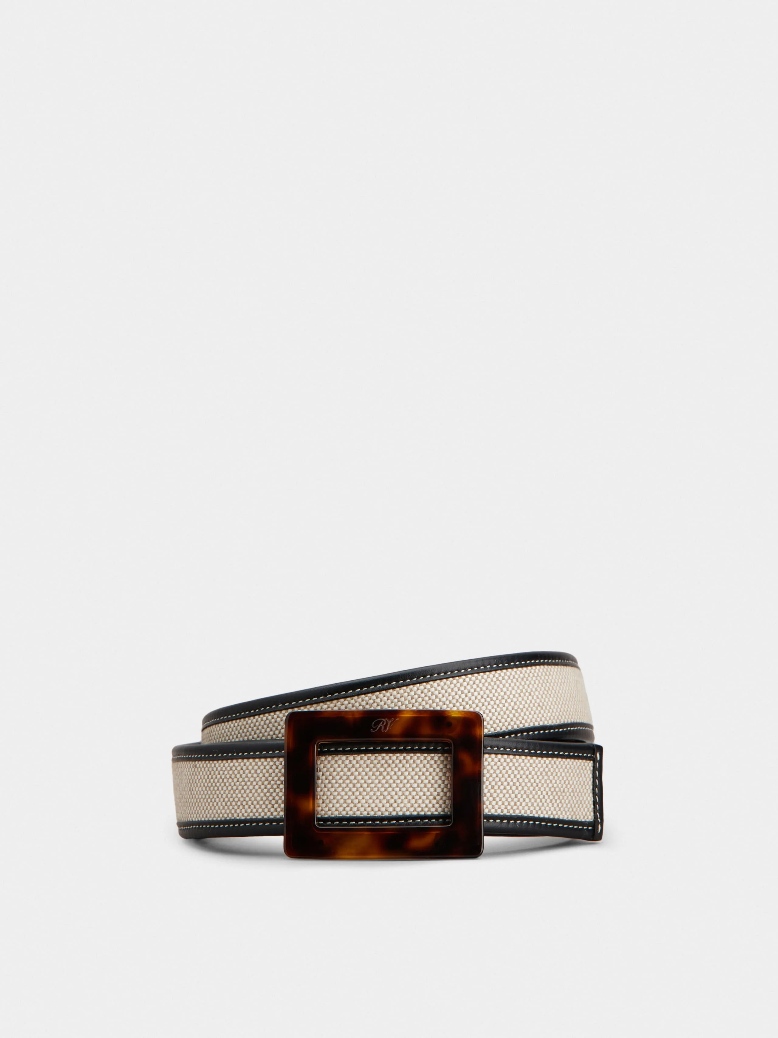 Created in 1965, the Belle Vivier buckle is an emblem of elegance and femininity. Its sophisticated and timeless allure is expressed in this belt in canvas and leather, with the iconic resin tortoise effect buckle. FEATURES - Belt width: 1.2 ins - Fabric - Calfskin leather piping - Resin buckle - Made in Italy RCWC0349101UFO9R21