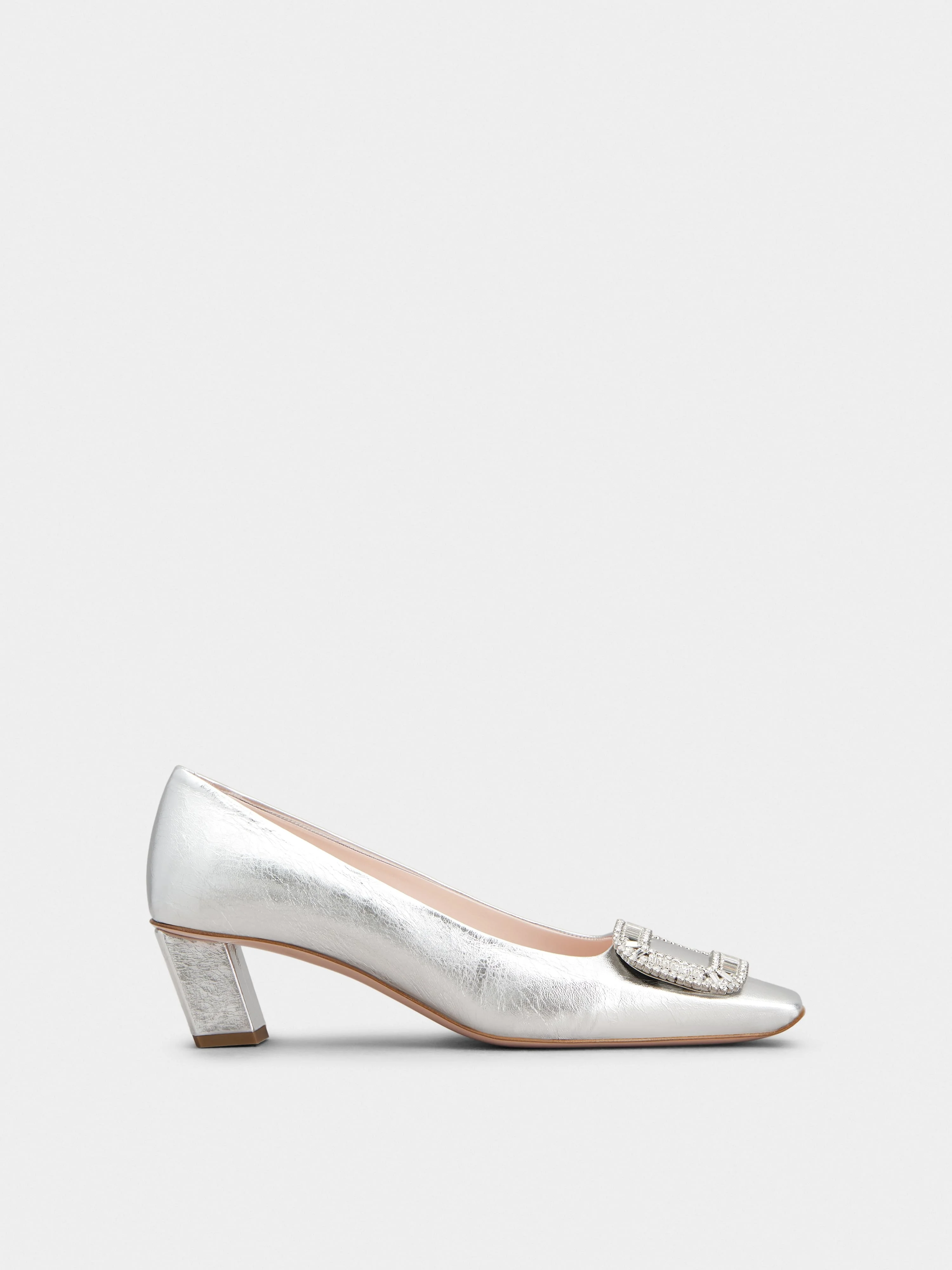 Launched in 1965, the Belle Vivier is one of the Maison's most famous designs. Becoming an icon thanks to its buckle and Skyscraper heel, its reinterpretations make it a new classic. Crafted in crinkled effect metallic leather, these refined pumps are the perfect ally for your days. Description & details Ovine leather Crinkled effect metallic finishing Crystal buckle Leather insole Leather outer sole Covered Skyscraper heel Heel height 1.8 ins Made in Italy Mod: RVW00602220T0HB200