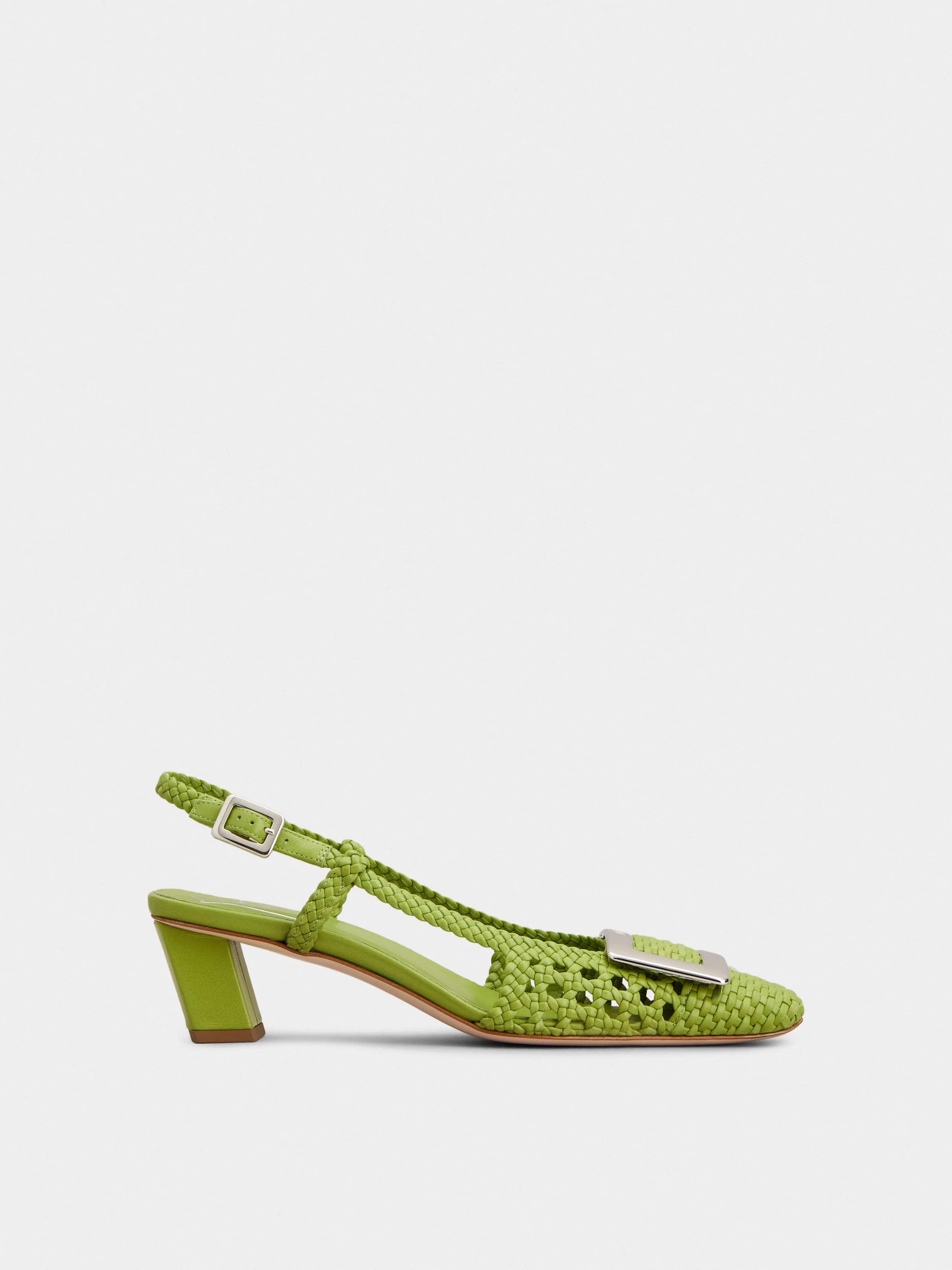 Launched in 1965, the Belle Vivier is one of the Maison's most famous designs. Becoming an icon thanks to its buckle and Skyscraper heel, its reinterpretations make it a new classic. Crafted in soft leather with braided detailing, these slingback pumps are the perfect ally of your days. Description & details Ovine leather Metal buckle Heel strap Leather insole Leather outer sole Covered Skyscraper heel Heel height 1.8 ins Made in Italy Mod: RVW00643130UPZV428