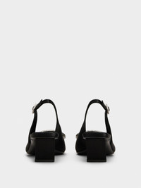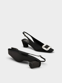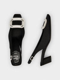 Launched in 1965, the Belle Vivier is one of the Maison's most famous designs. Becoming an icon thanks to its buckle and Skyscraper heel, its reinterpretations make it a new classic. Crafted in satin at our ateliers, these slingback pumps are the perfect ally of your days. Description & details Silk blend satin Crystal buckle Heel strap Satin insole Leather outer sole Covered Skyscraper heel Heel height 1.8 ins Made in Italy Mod: RVW00643110RS0B999