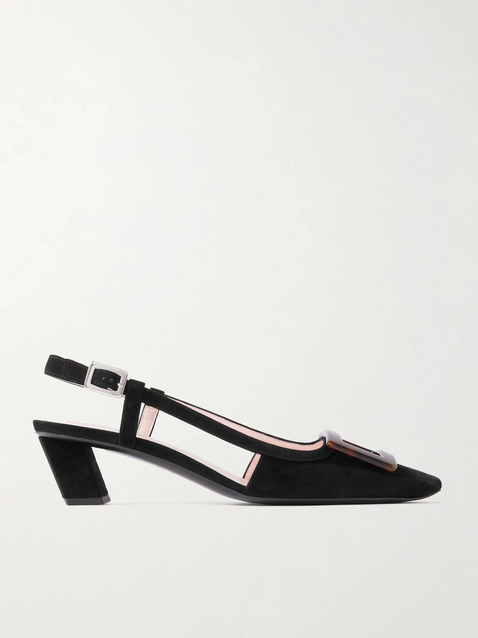 Roger Vivier's 'Belle Vivier' pumps debuted in 1965 and remain just as timeless and elegant today. This version is made from smooth suede and topped with tortoiseshell buckles at the square toes. The 45mm heels offer comfortable lift while the slingback straps can be adjusted to ensure a secure fit. Size & Fit - Fits true to size, take your normal size - Italian sizing Details & Care - Heel measures approximately 45mm/ 2 inches - Black suede (Goat) - Buckle-fastening slingback strap