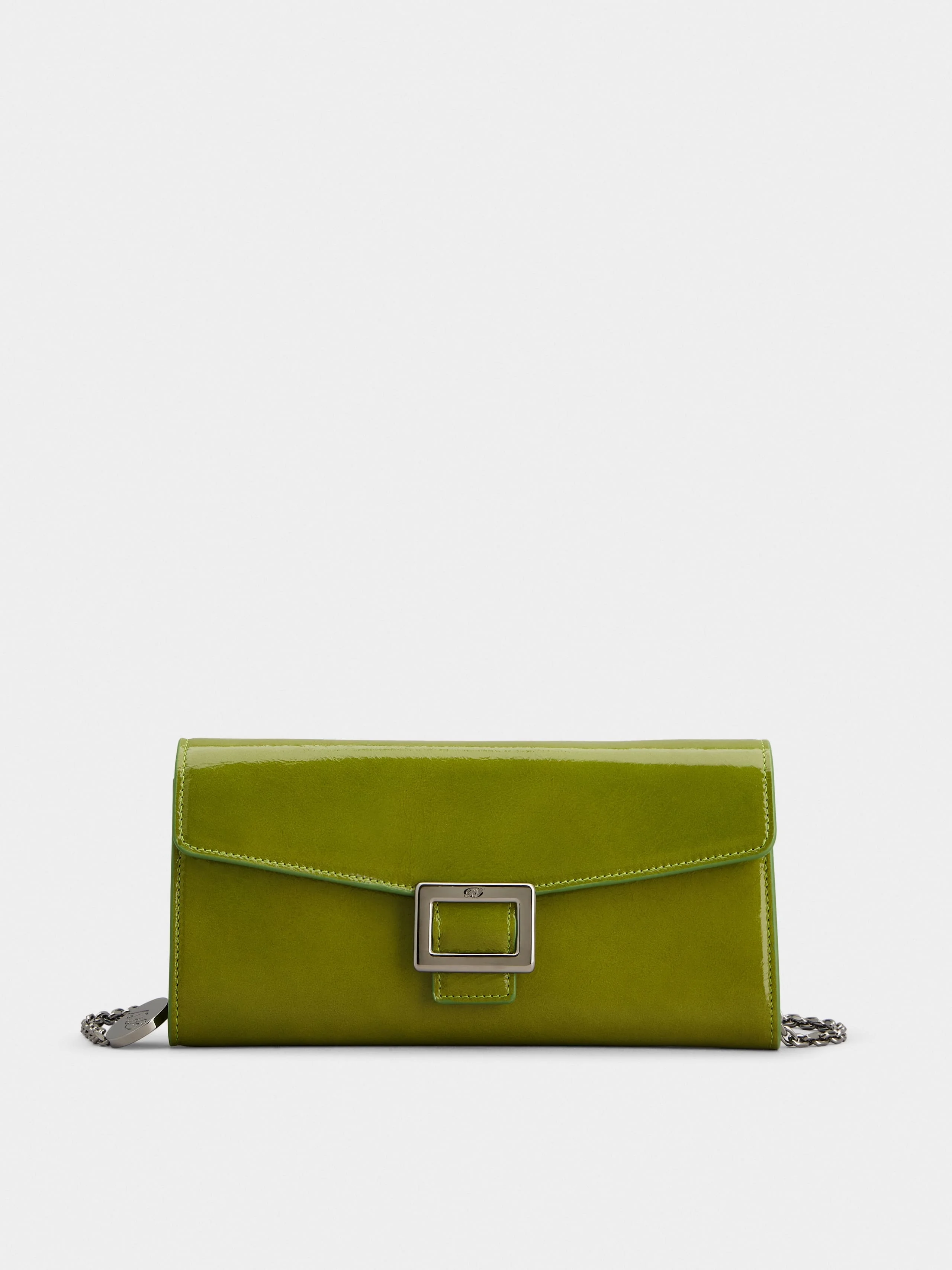 Created in 1965, the Belle Vivier buckle is an emblem of elegance and femininity. Its sophisticated and timeless allure is expressed in this wallet on chain in patent leather with the iconic metal buckle. Closed with flap and snap, it can also be worn cross-body as a mini bag. Description & details Dimensions: L 8.7 ins x H 4.1 ins x D 1.6 ins Patent leather Metal buckle Removable chain Snap closure 1 zipped coin pocket 1 flat pocket 6 cardslots Made in Italy Mod: RAWAWSB4400UKP1N31